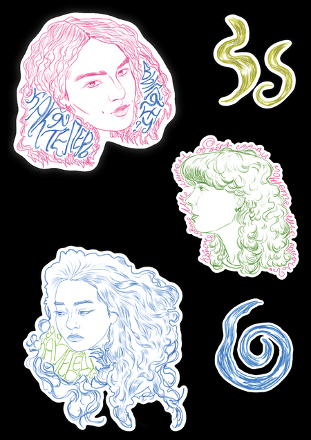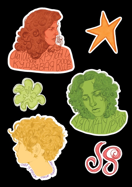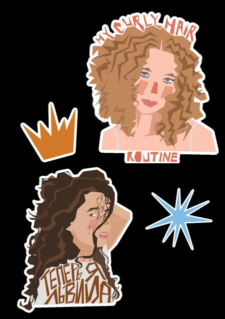 Серия стикерпаков с кудрявыми девушками и их эмоциями, связанными с их волосами и не только. Каждый стикерпак выполнен в своей технике.