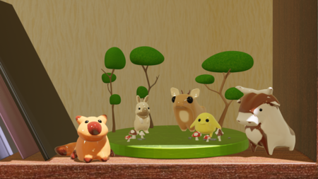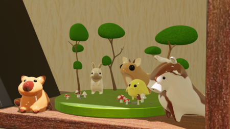 Линейка игрушек включает в себя несколько кукол, в комплекте с которыми идут декоративные деревья, грибочки и камушки, а также подставка в виде лесной полянки.