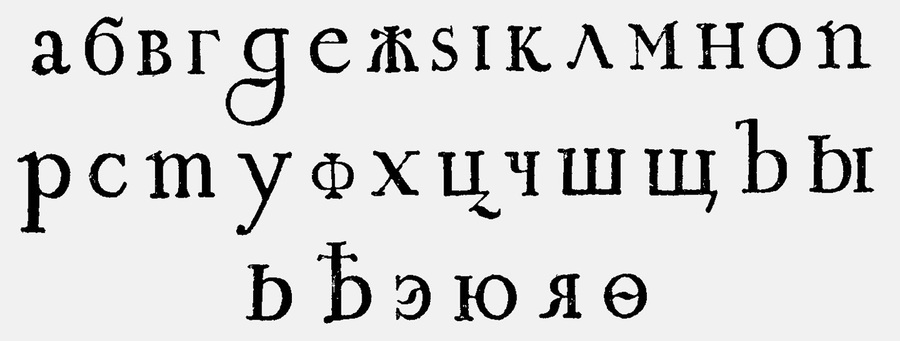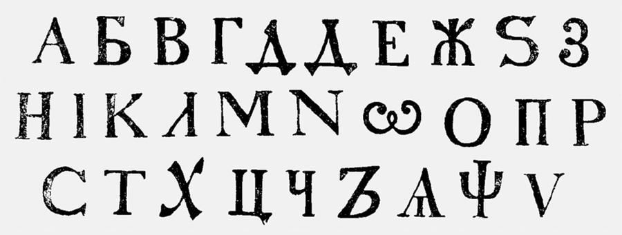 Форма букв приблизилась к форме латинской антиквы, но не копировала её полностью. Некоторые элементы выглядели непривычно: например, у букв А, У, Х исчезли внутренние засечки, а конструкции П, Р и Т получили необычные верхние окончания штрихов. В шрифтах крупного кегля отличия особенно заметны, но в мелком и среднем размере литеры были ближе к западным образцам (видимо, мелкие неточности при наборе меньше бросались в глаза).