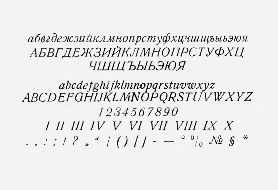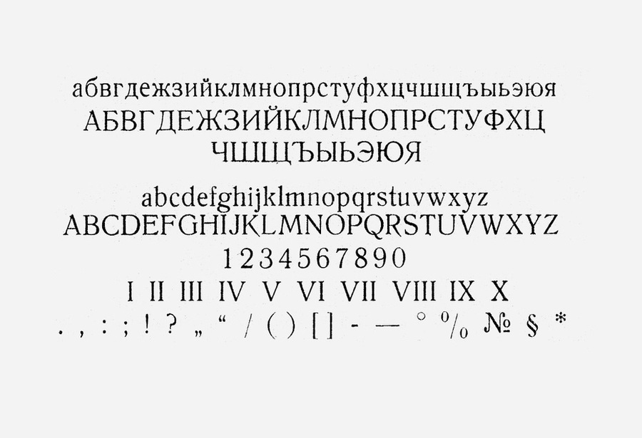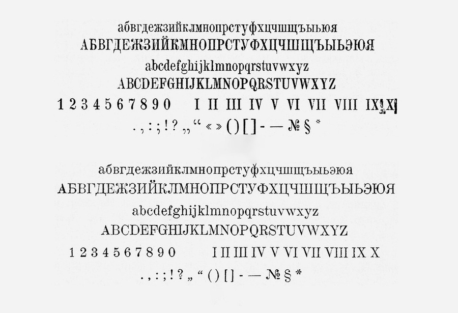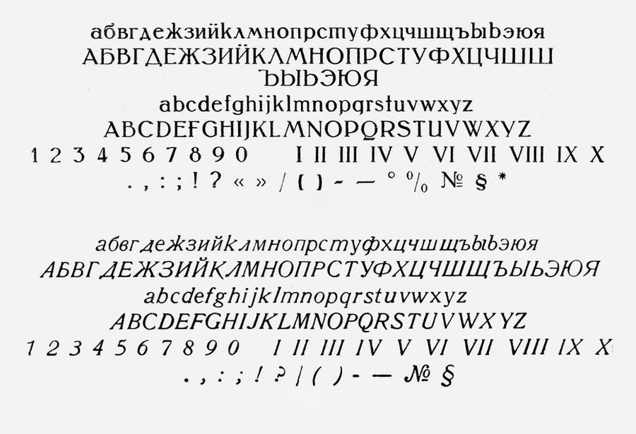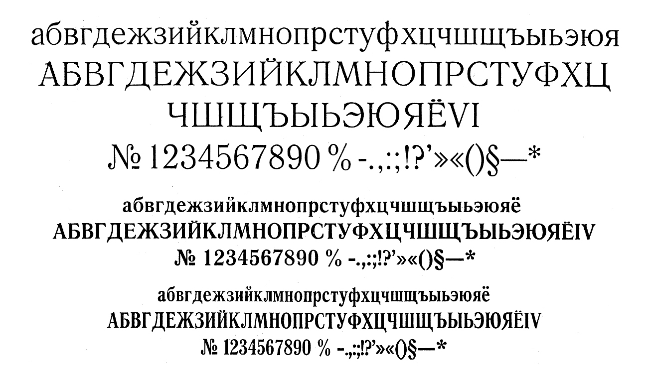 Особенно хочется отметить шрифты Латинская и Академическая. Латинской набиралось около 70% книг, а популярная Академическая являлась кириллизацией западного шрифта Sorbonne (H. Berthold, Berlin, 1905).
