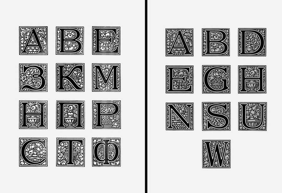 Отдельного внимания заслуживает ошибка, которую делают даже опытные дизайнеры, она заключается в использовании латинской капители для кириллического набора. В кириллице большинство строчных букв значительно ближе по конструкции к прописным, чем в латинице, поэтому если создавать капитель в тех же пропорциях, что и латинскую, она практически не выделяется в тексте, теряя свою функцию акцентирования. Чтобы избежать этого, капитель для кириллицы должна быть чуть крупнее и выделяться сильнее.