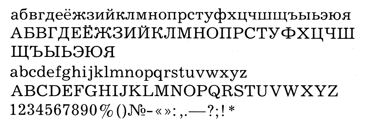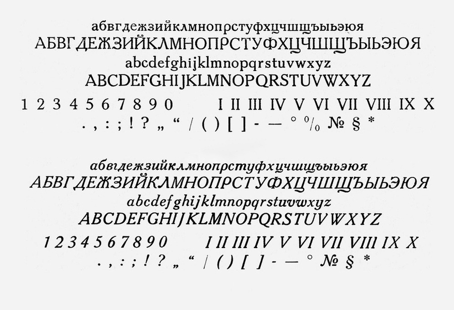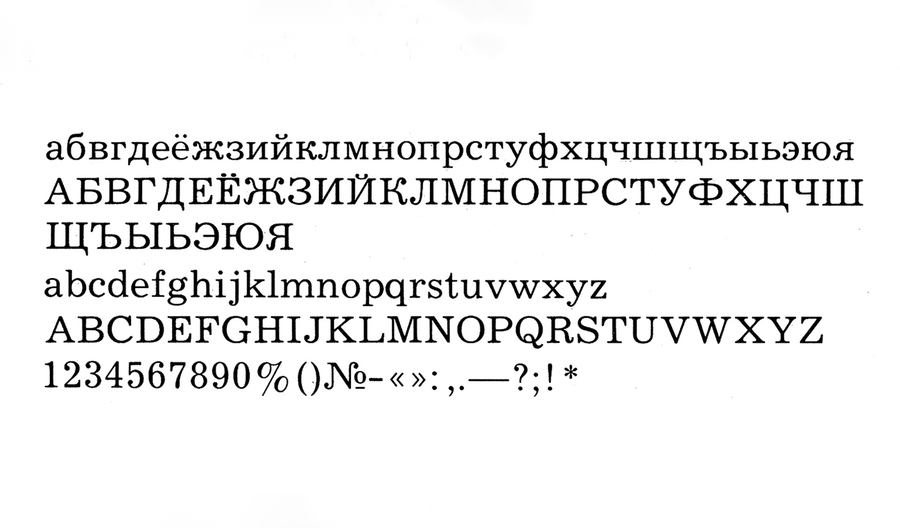 Внешние влияние латинских шрифтов продолжало существовать, однако полиграфическая отрасль использовала адаптации западных моделей и перерабатывала под кириллическую традицию и требования советской печати. Именно поэтому советская кириллица середины XX века выглядит настолько цельно и ровно: над ней работали профессионалы внутри строгой системы, где каждый штрих проходил проверку. Ошибок или «кривых» форм почти не было, ведь никто, кроме профессионалов, просто не имел доступа к созданию шрифта.