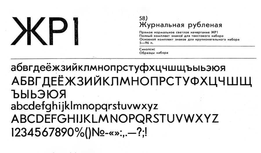 Шрифт «Журнальная рубленая» был выпущен в 1947 году, но поддерживал только кириллицу. Через несколько лет появилась версия с латинским алфавитом. Интересно, что шрифт ещё называли «Futura для бедняков». Futura был популярным и современным шрифтом в западном дизайне, но так как в СССР его не было, текст набирали «Журнальной рубленой», потому что это был единственный более-менее геометрический гротеск, доступный в наборной системе.