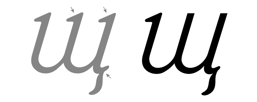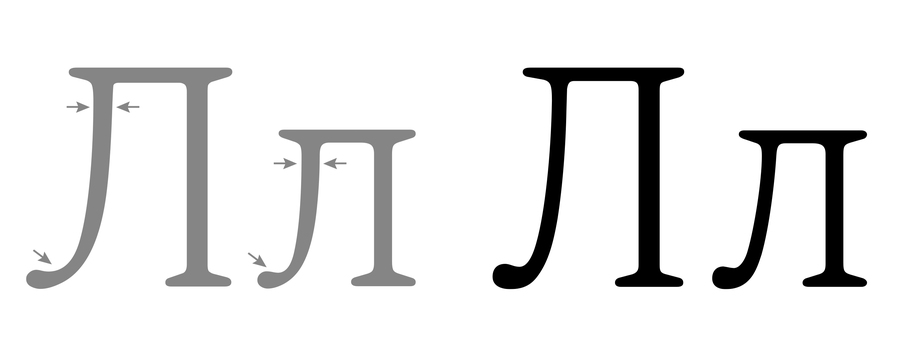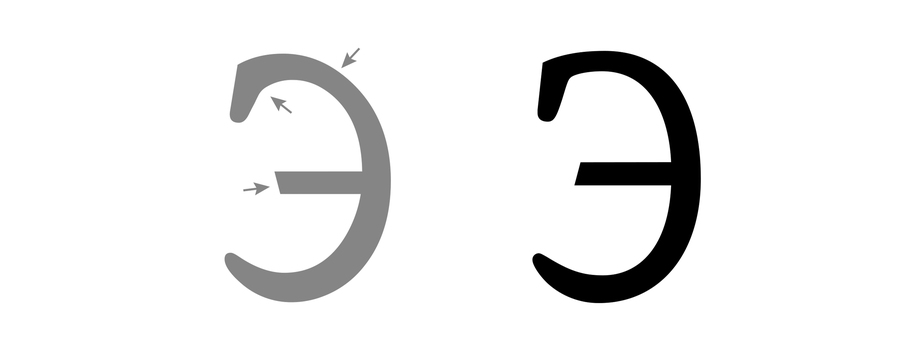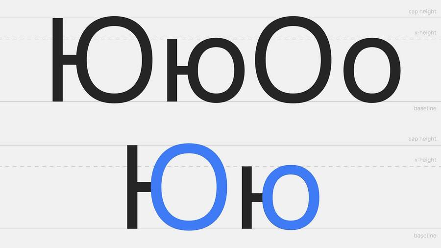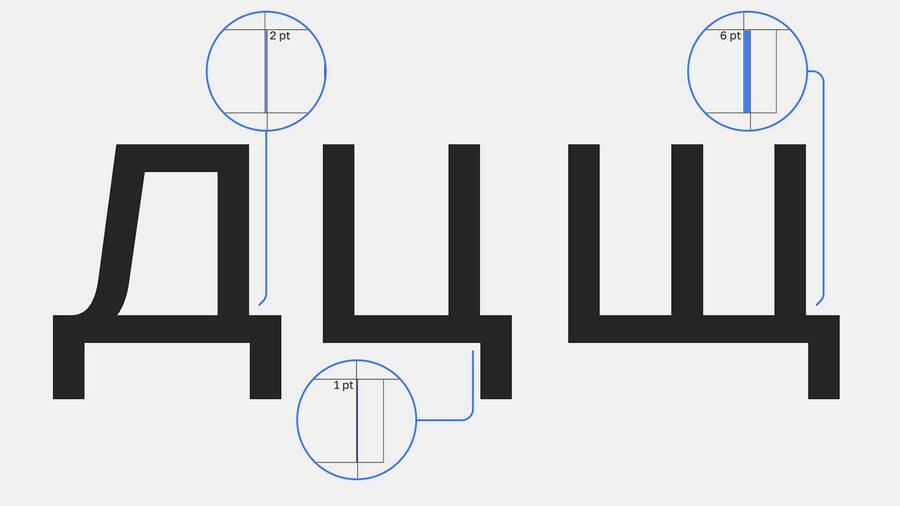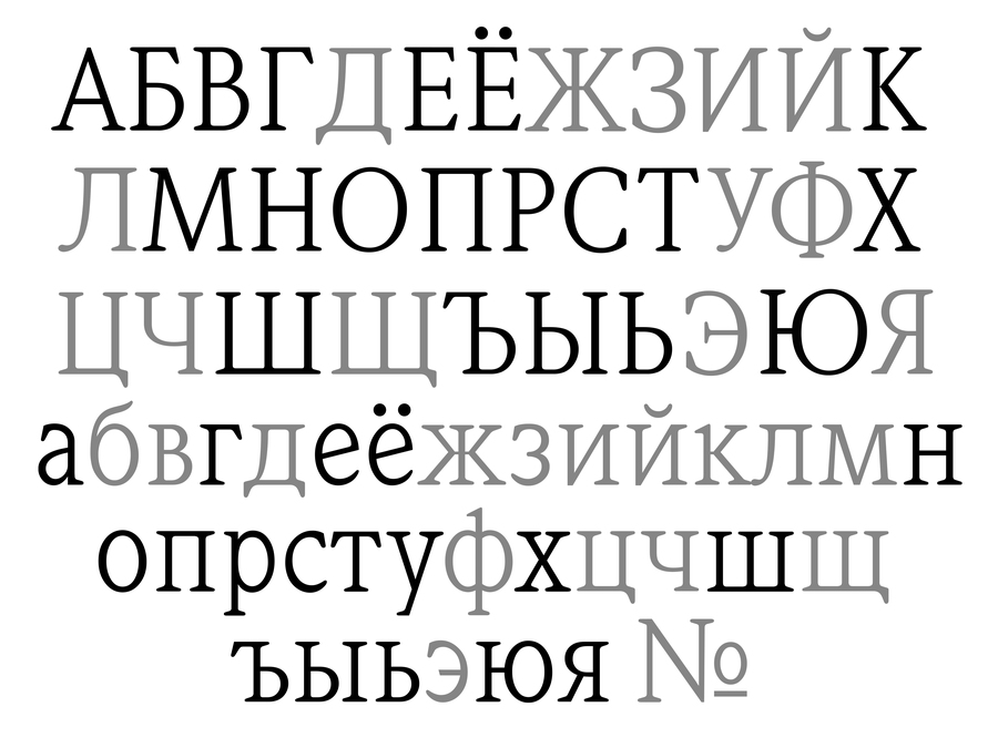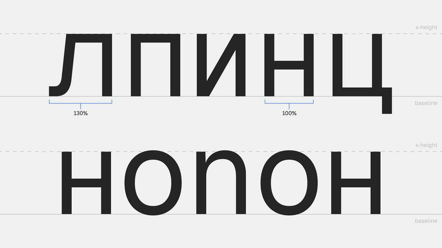 Похожая проблема возникает там, где латинская традиция задаёт общую схему округлых форм. Кириллица гораздо менее круглая, в ней доминируют прямые штрихи (н, п, ш, и другие конструкции, построенные на вертикалях и перекладинах). В результате текстовый ритм смещается: латиница «дышит» через чередование округлостей и вертикалей, а кириллица через плотные, почти архитектурные блоки. Попытка «усреднить» ритм приводит к визуальным артефактам, например, слишком тяжёлым строкам, нарушению баланса белого пространства, ощущению грубого тона.