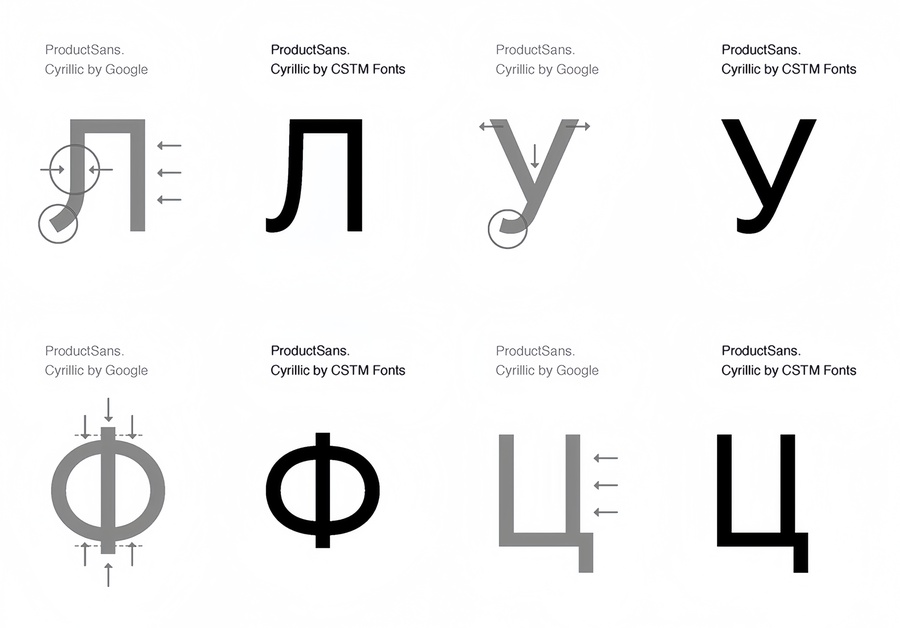 Илья Рудерман и Юрий Остроменцкий правят кириллицу в шрифте Google ProductSans; панграммы — короткий текст, использующий все буквы, в каждом из этих шрифтов есть неточности
