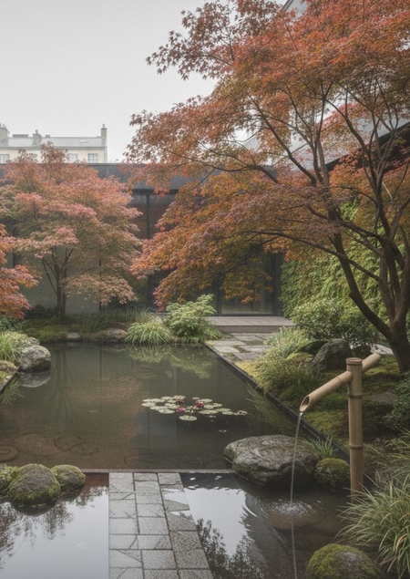 Камерный сад-убежище в стиле Кадзуюки Исихары. Геометричный водоем-зеркало объединяет дом с живыми стенами из мха и изящными кленами. Пространство, где через игру света и звуки воды оживают детские воспоминания о гармонии и покое.