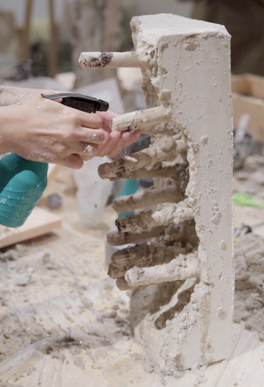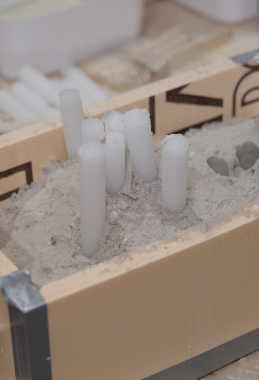 Гипс в песчаной формовке дает возможность наблюдать одновременно и за текучестью материала, и за его устойчивостью. Важная часть процесса — его медитативность, ускорить процесс увлажнения каждого слоя невозможно, полости деформируются, каркас плывет.
