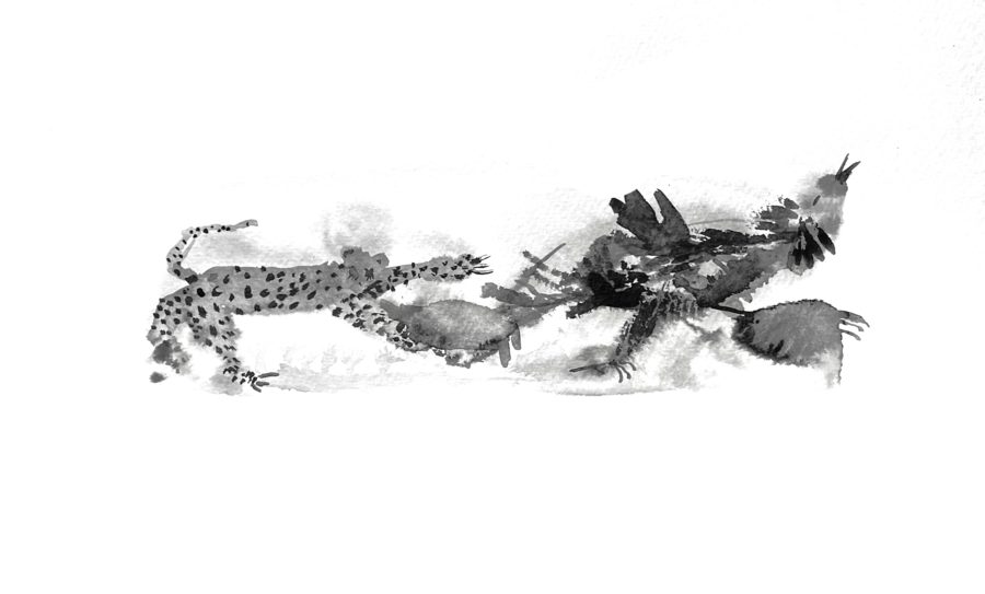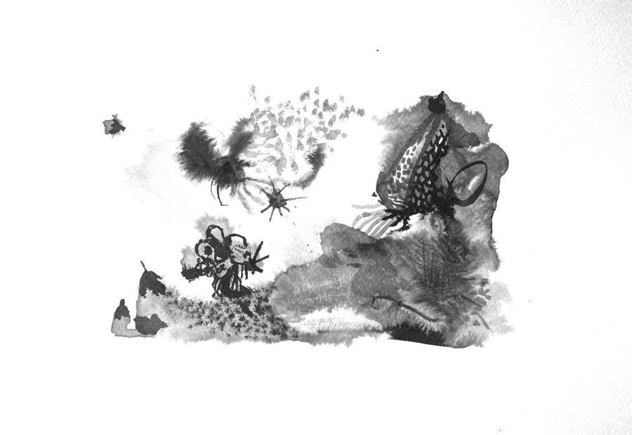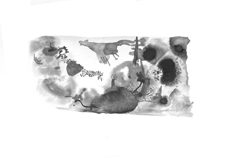 Я принимала линии и пятна такими, какими они получались и погружалась в процесс, оставляя все посторонние мысли. Потом, когда работа подсыхала, мне было интересно дополнить ее деталями сухой кистью. Так получилось что-то наподобие растительных форм, инопланетных или не очень пейзажей и иногда вполне конкретных зверей. В результате я преодолела свое смущение перед абстрактным рисованием, отпустила себя и развлеклась поиском сюжетов.