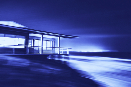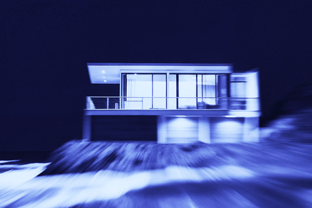 Промт — blue inversion, brightness, background blur, house on a cliff, modern, elite, youth, sea, loud parties, blue color, bright light, evening