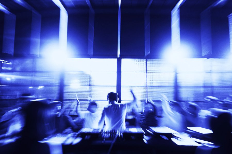 Промт — blue inversion, brightness, background blur, poster for a DJ set in a local club, explosion of emotions, mystery, deep blue colour