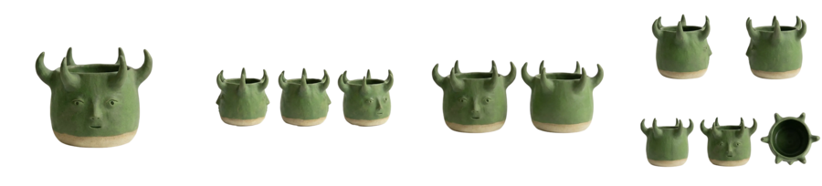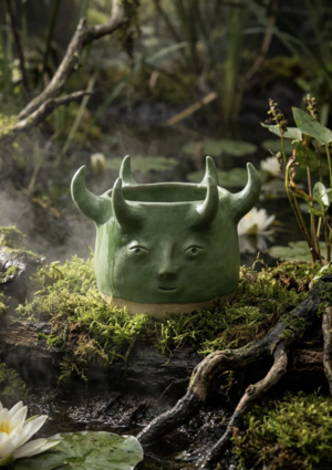 Биоморфные объемы и мягкие переходы поддерживают ассоциации с органикой, а матовая зелёная поверхность и натуральный глиняный низ закрепляют материальный код «земли и леса». В итоге утилитарный предмет становится скульптурным носителем истории, сохраняя функциональность и создавая эмоциональную привязанность и коллекционность.