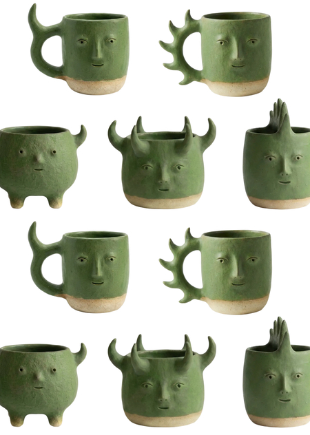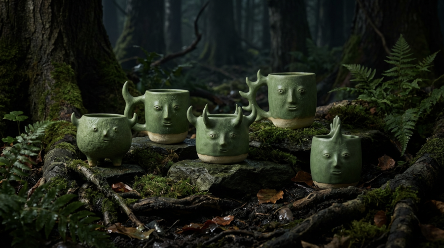 Коллекция кружек построена на образах лесных духов — маленьких сущностей, которые могли бы жить в лесной тени, у кромки болота или среди мха и коряг. Это не персонажи в буквальном смысле, а одухотворённые образы места: дух мха, дух болотной воды, дух коры и ветвей.