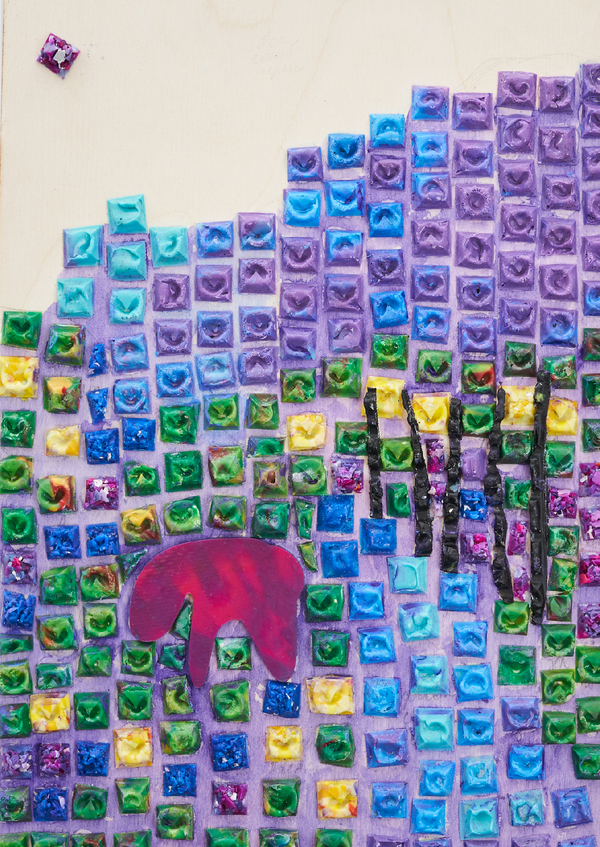 Работа с цветом для меня была важнейшей составляющей. Так как специально для этого проекта я нарисовала сюжет, который хотела воплотить в мозаике, и если работать с акрилом я умею, то выкладывать мозаику и подбирать кубики по цветам оказлось непростым занятием. Я хотела чтобы работа казалась достаточно, абстрактной, но при этом считывался замысел — лошадка в горах.