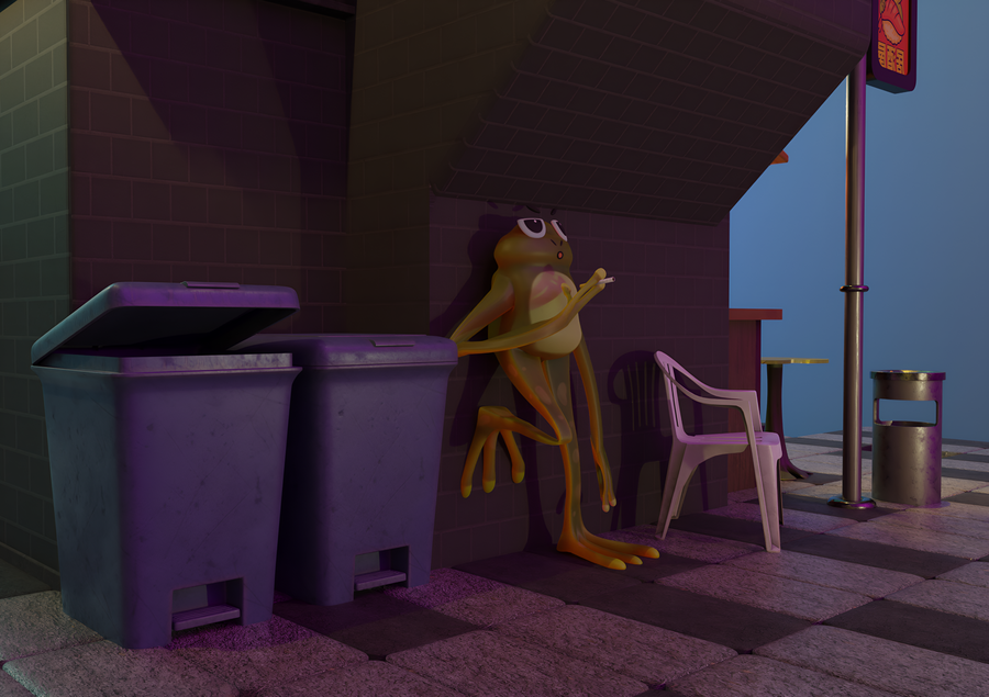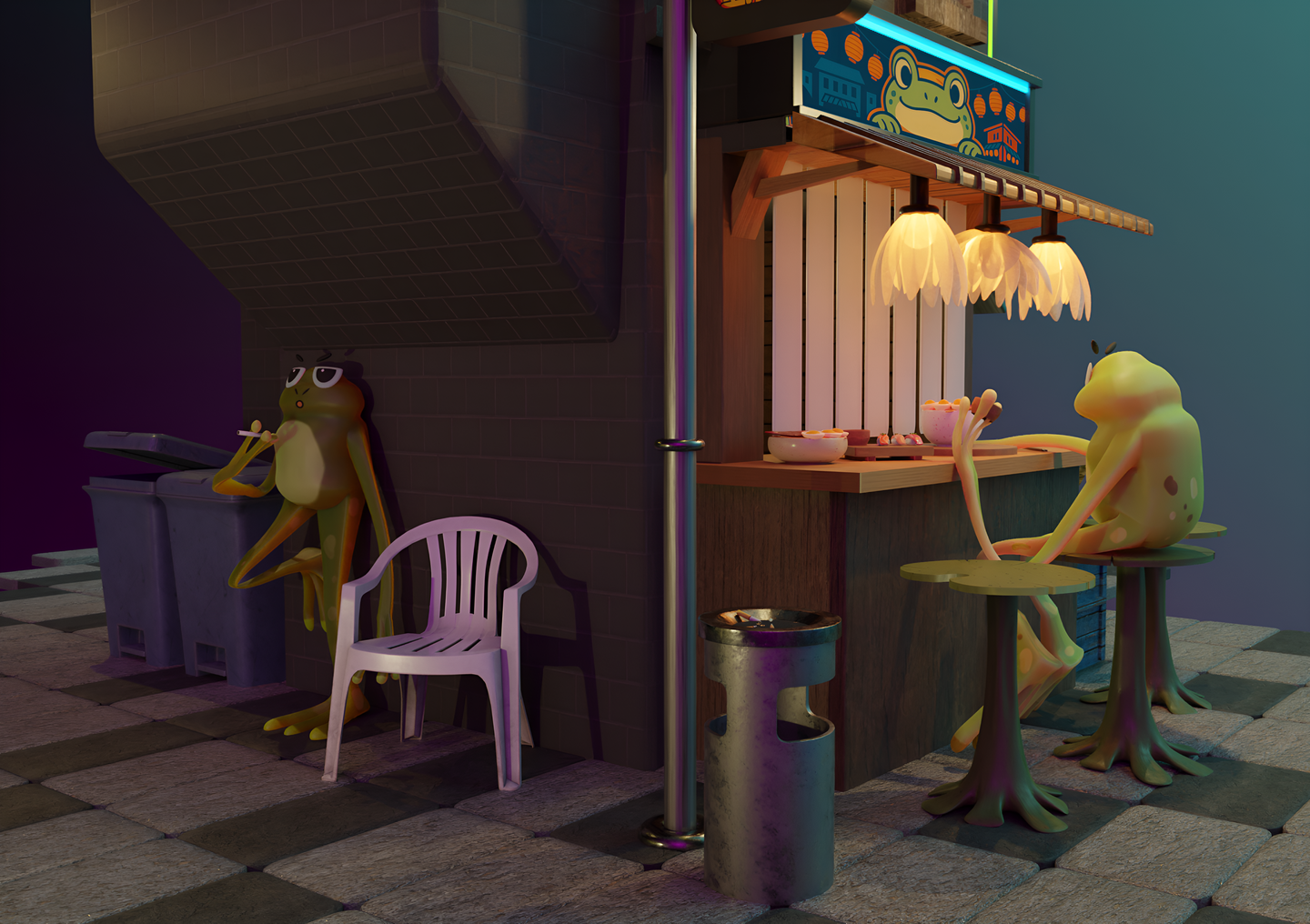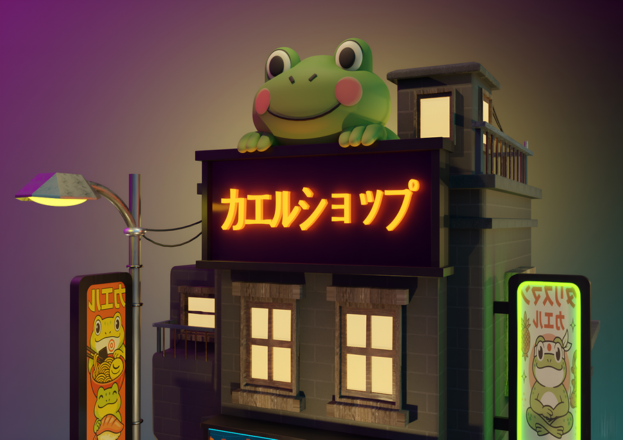 Проект «Лягушачья Лавка» — это маленькая, уютная уличная торговая точка, работающая в тишине глубоких ночных улиц. Её хозяин — обаятельная лягушка.Характерной деталью является фигура лягушки, размещённая на крыше и служащая узнаваемым элементом заведения
