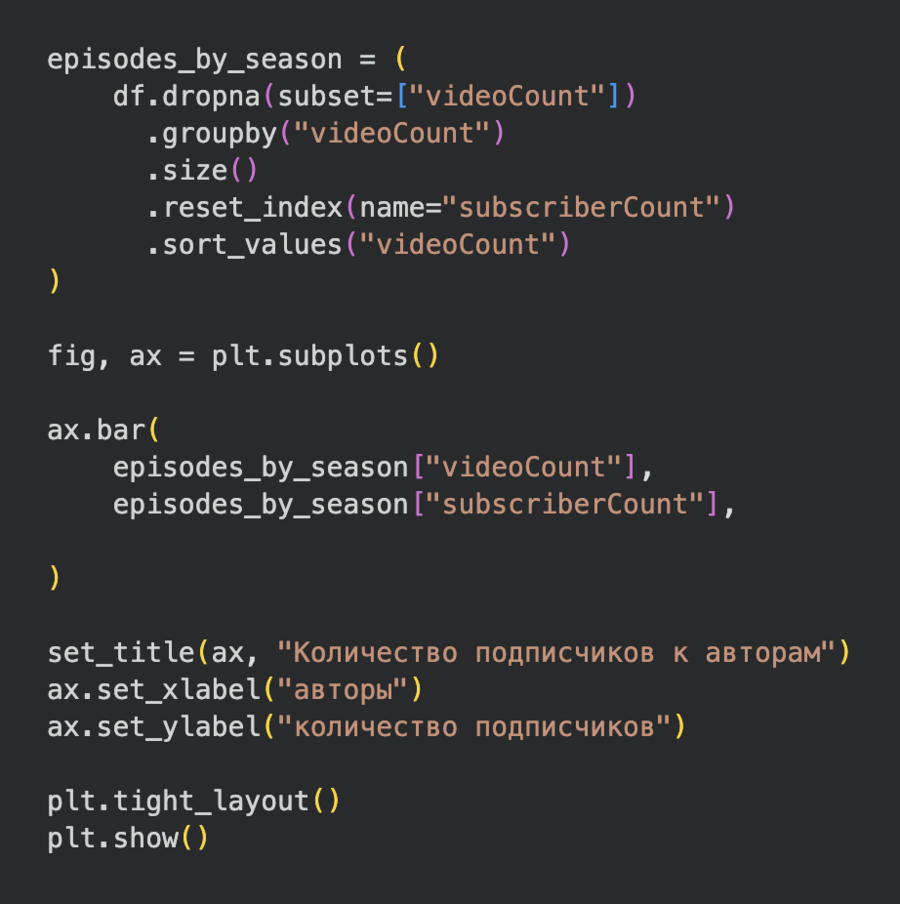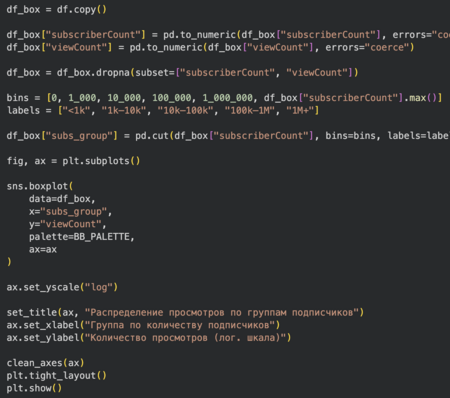 Ключевым первым шагом в анализе стало изучение структуры и содержания датасета. Для сравнения количества подписчиков, измерения видеоколичества, сравнения просмотров и выявления просмотров на подписчика использовались различные типы графиков.