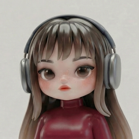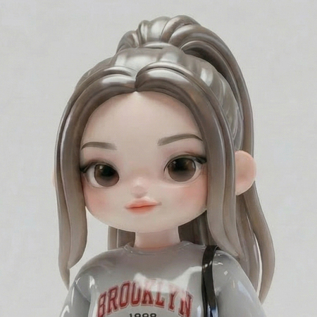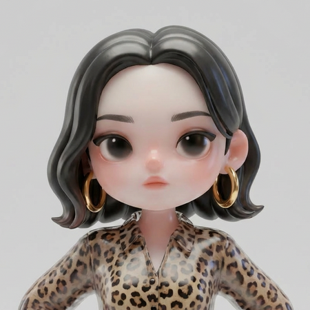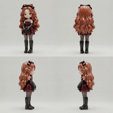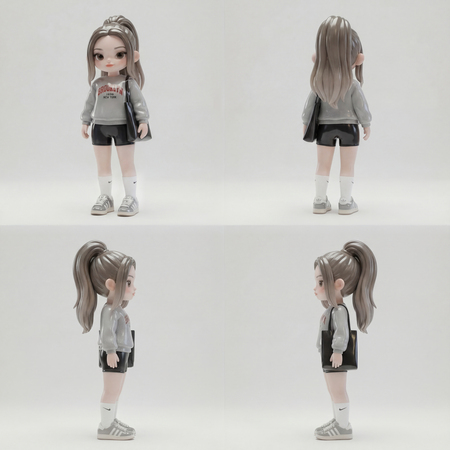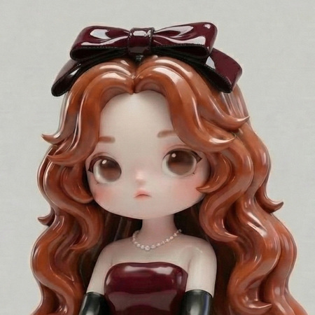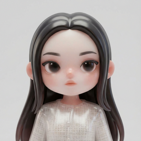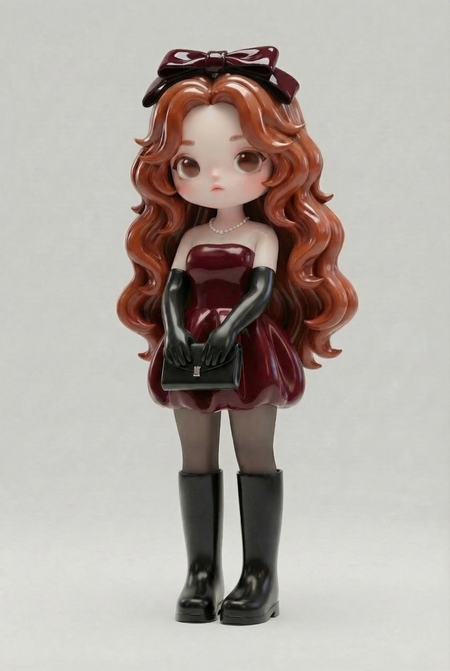 Сохрани стиль: увеличенная голова, большие выразительные глаза, мягкие пропорции, гладкие формы, аккуратные детали одежды, глянцево-матовая поверхность, ощущение премиальной 3D-фигурки.