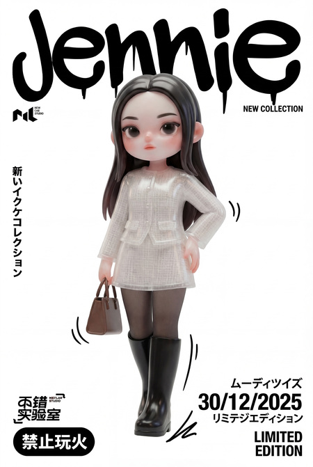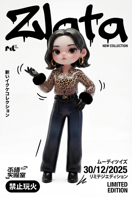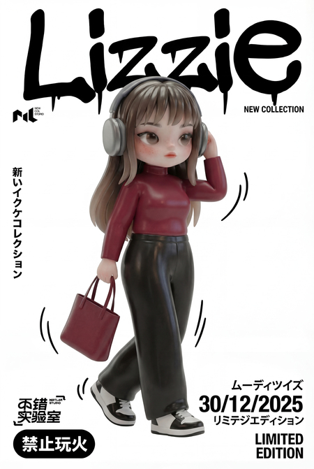 Создай модный рекламный постер коллекционной 3D-фигурки в стиле designer toy / fashion doll.