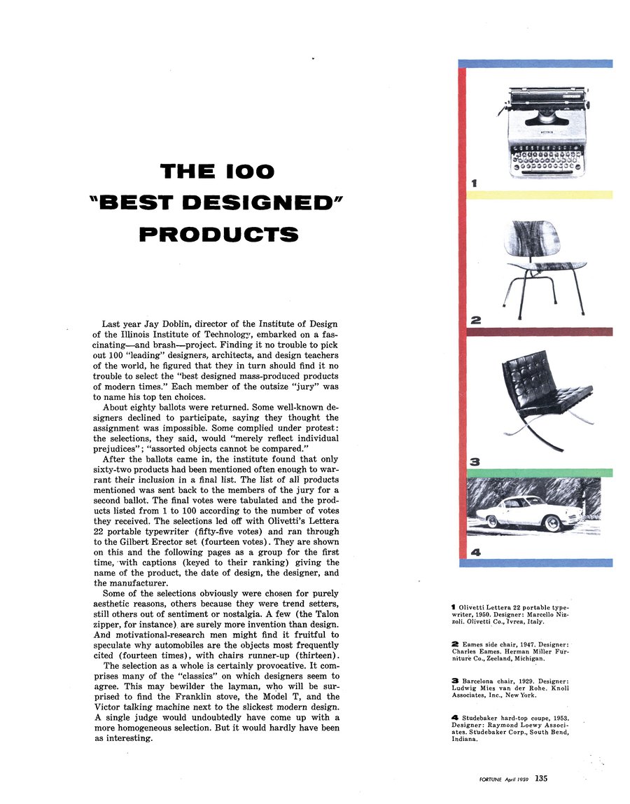 100 продуктов современности с лучшим дизайном, составитель Джэй Доблин, публикация в журнале Fortune Magazine, 1959