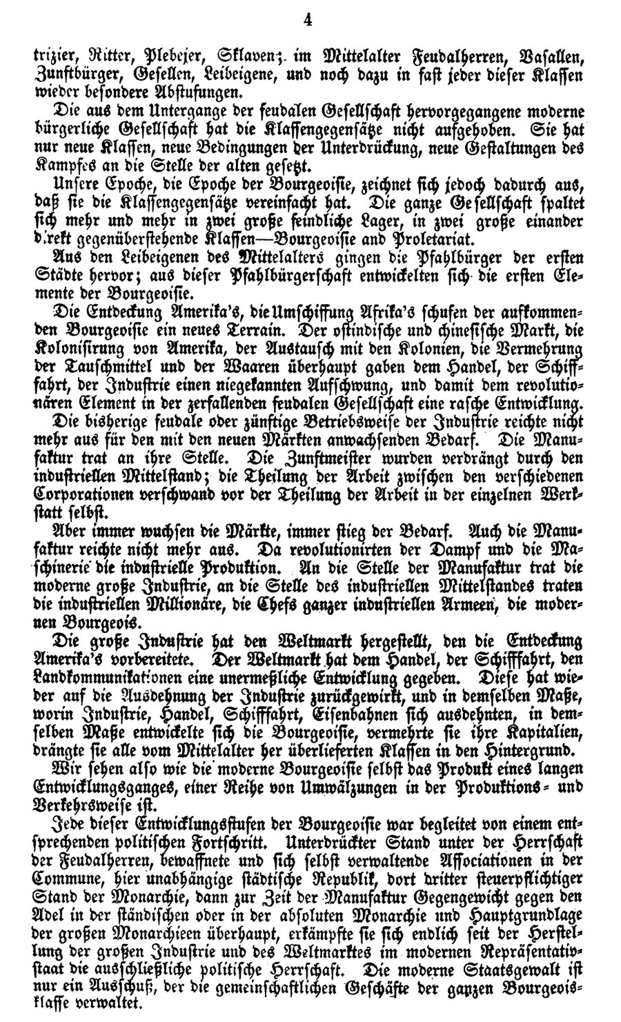 Использование готического шрифта (фрактуры) в первом немецком издании 1848 года было стандартной типографской практикой для немецкоязычных публикаций того времени. Выбор шрифта был обусловлен исключительно утилитарными целями. Текст был напечатан как скромная брошюра для легкой распространяемости и читабельности.