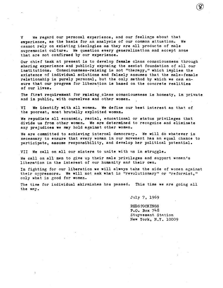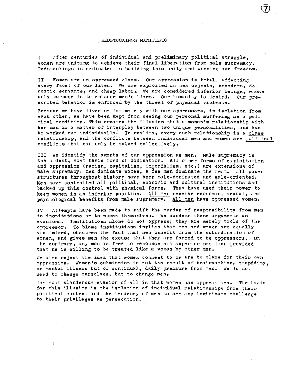Манифест возник в контексте широкого движения за гражданские права 1960-х годов, но его авторы (включая Эллен Уиллис и Кэти Сарачайлд) отвергли подходы как либерального феминизма (который, по их мнению, шел на компромиссы), так и социалистического феминизма (который подчинял женский вопрос классовой борьбе). «Redstockings» (название объединяет «синий чулок»* — старое прозвище феминисток, и «красный» — революционный) стремились создать независимое движение, основанное на собственном опыте женщин и принципах «повышения сознательности» (consciousness-raising).