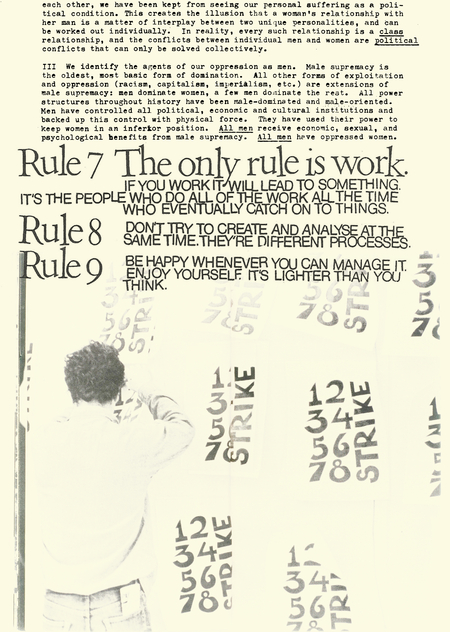 Визуальное оформление манифеста напрямую отражает принципы модернистского дизайна начала 1960-х годов, отличающегося функциональностью и прямотой. В этом смысле форма полностью рифмуется с содержанием, но никакого метапослания не создает, поскольку она — просто констатация определенной визуальной эпохи.