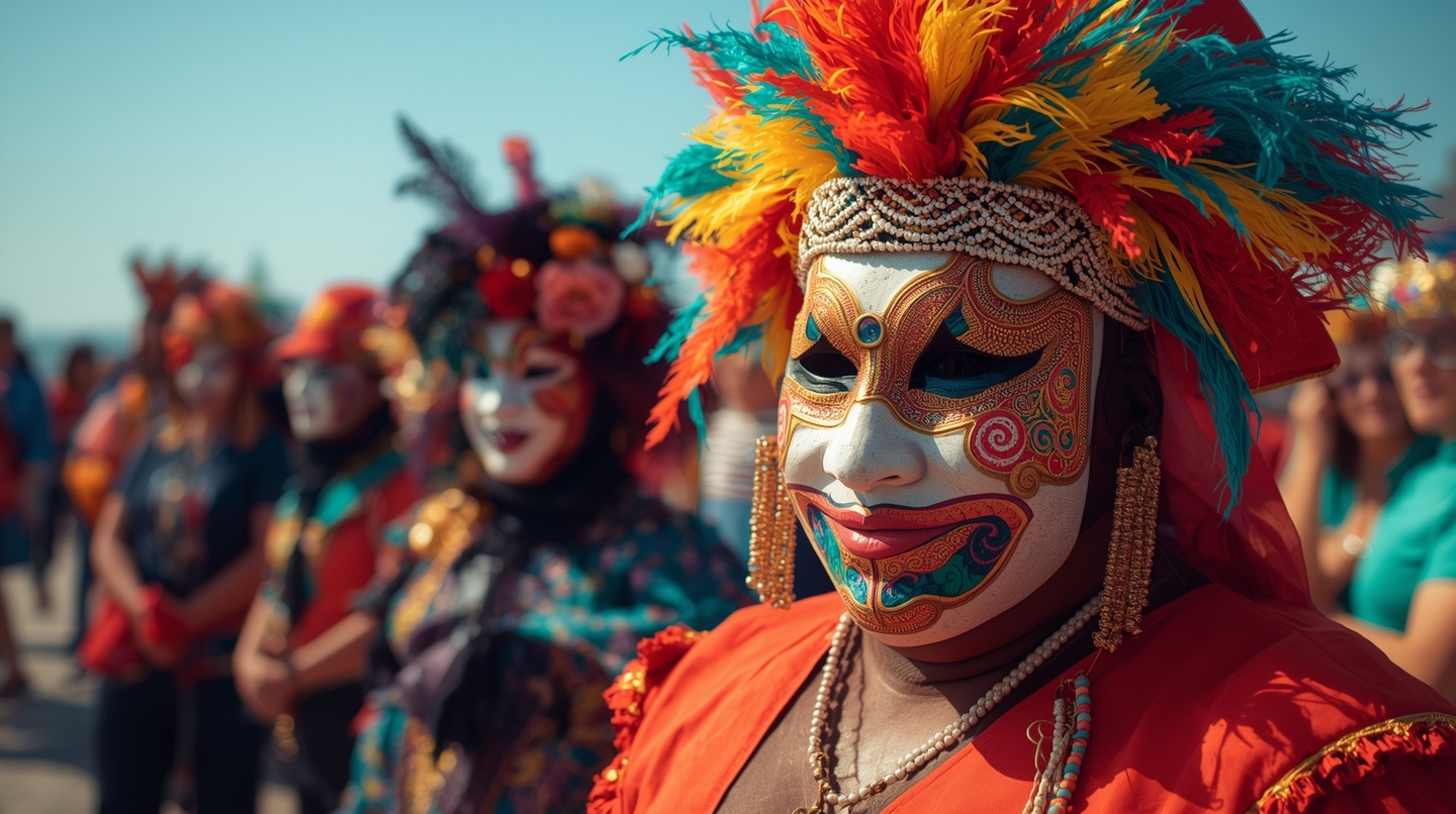 Style keywords: photorealistic, artistic festival, cultural diversity, handmade masks, folk celebration, natural daylight, joyful crowd, colorful geometric design, community spirit, documentary photography