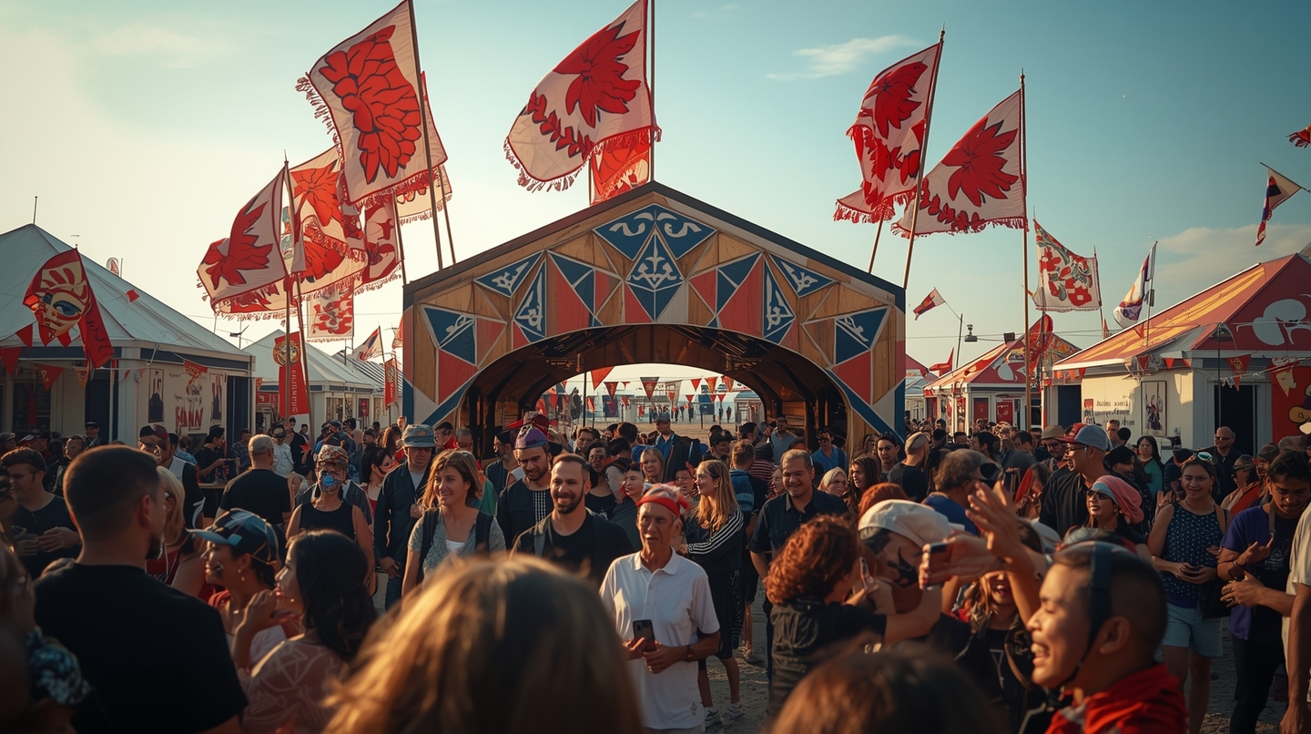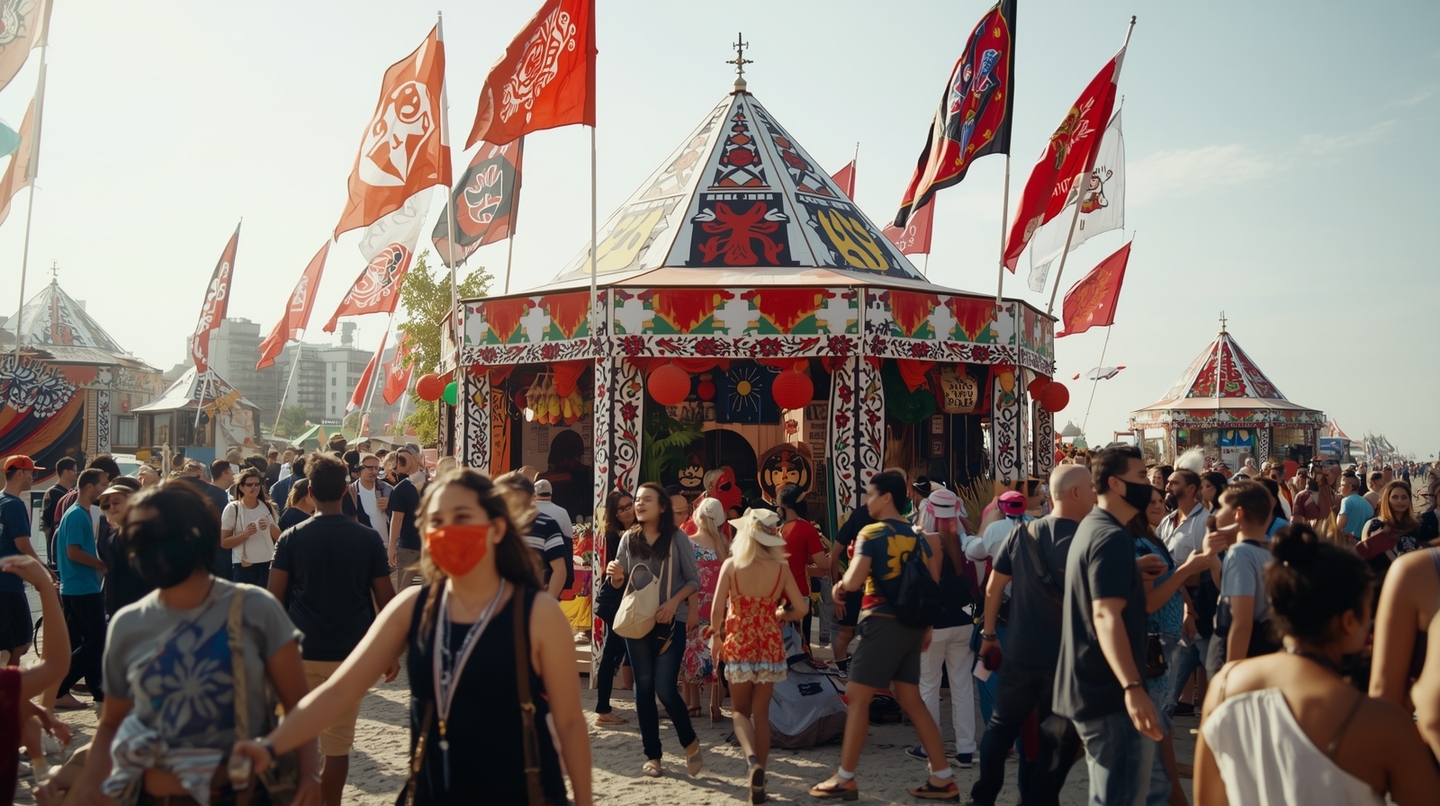 Leonardo AI: Open-air Festival of Masks, filled with color, culture, and joy. A vibrant seaside scene with artistic pavilions, tall red and white fabric flags waving in the wind, and people wearing traditional and modern masks from around the world — African, Japanese, Slavic, Indian, and Latin American styles. The atmosphere is festive and creative, with handmade decorations, banners, and musical performances. The main structure is a colorful geometric pavilion with folk-inspired patterns, surrounded by visitors dancing, laughing, and interacting. Natural light, warm tones, and slight sea breeze. Colors are bright yet balanced — red, white, black as the main palette, with a few cheerful accent colors.