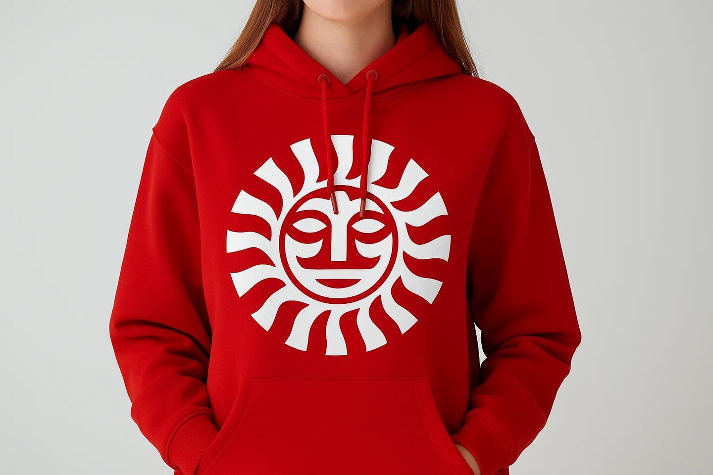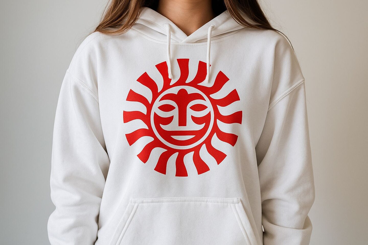 Sora: Create a branded hoodie with the logo from the attached photo. The hoodie is on a girl, the background is minimalistic. We can’t see her face