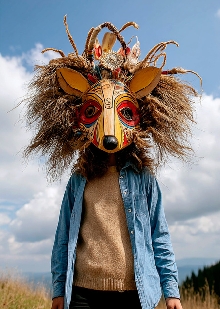 Midjourney: (постер 2): make a poster to festival of mask. The picture on the poster are realistic. there are people in the different national mask. the season is summer --chaos 5 --ar 2:3 --stylize 50