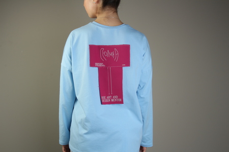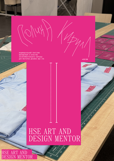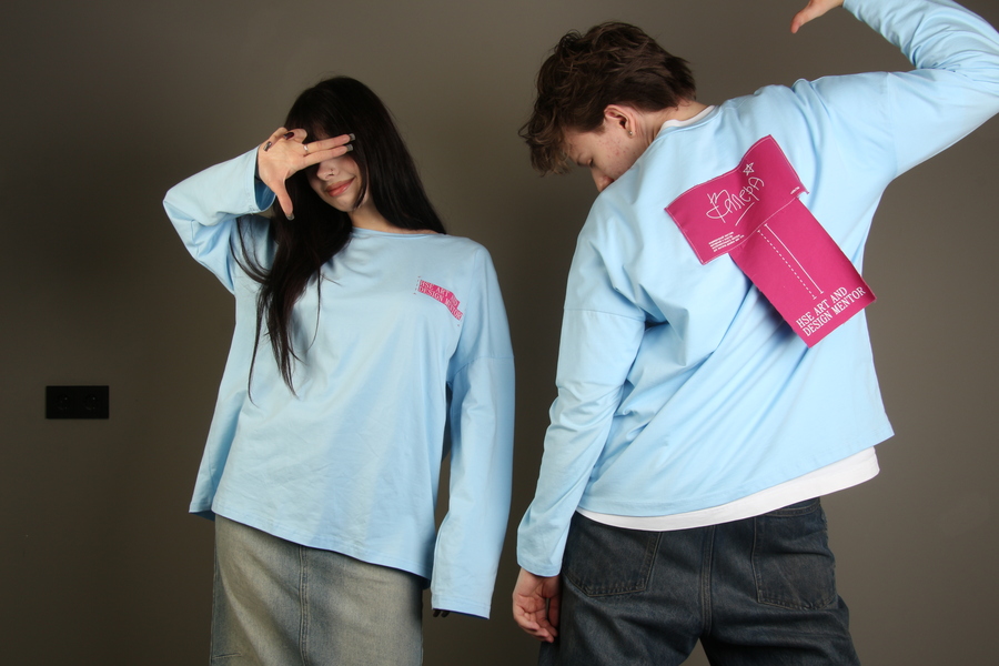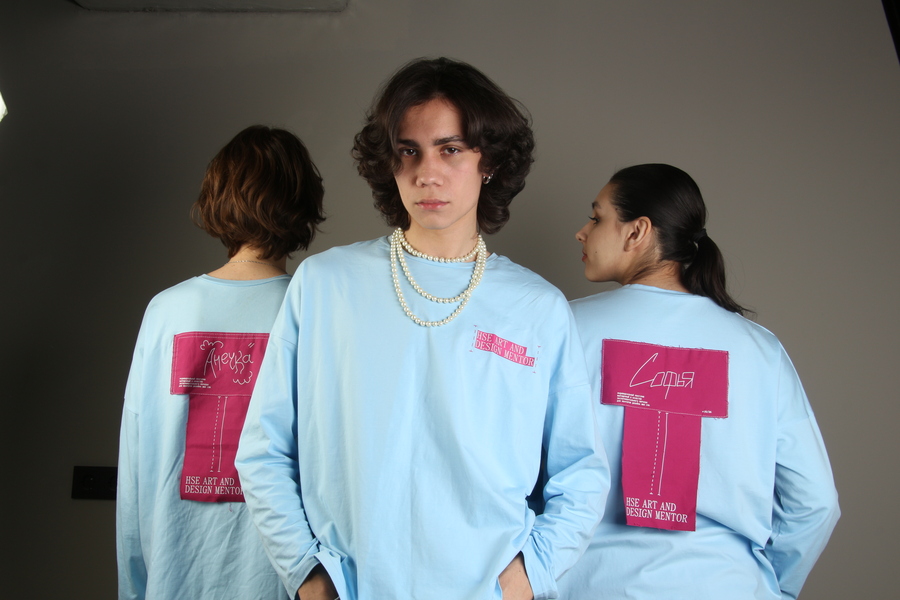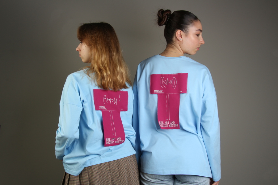 Основной целью было создать изделие, которое смогло бы репрезентовать не только ОП «Дизайн», но и уникальность каждого члена команды менторов. Совмещение линий разметки, акцентных швов и необработанных краев придает изделию настроение легкой хаотичности и недосказанности, присущей дизайнерам, а сочетание контрастных голубого и розового акцентирует яркость и эксклюзивность их характера. Имена каждого ментора написаны собственноручно самими людьми, что подчеркивает уникальность и оригинальность каждого члена нашей команды.