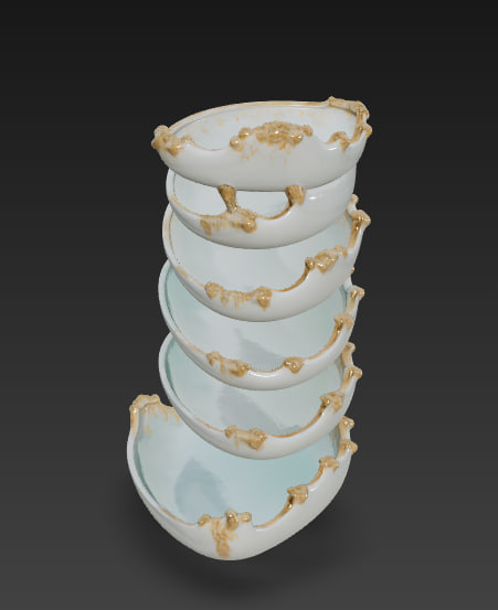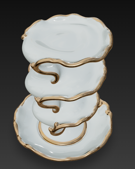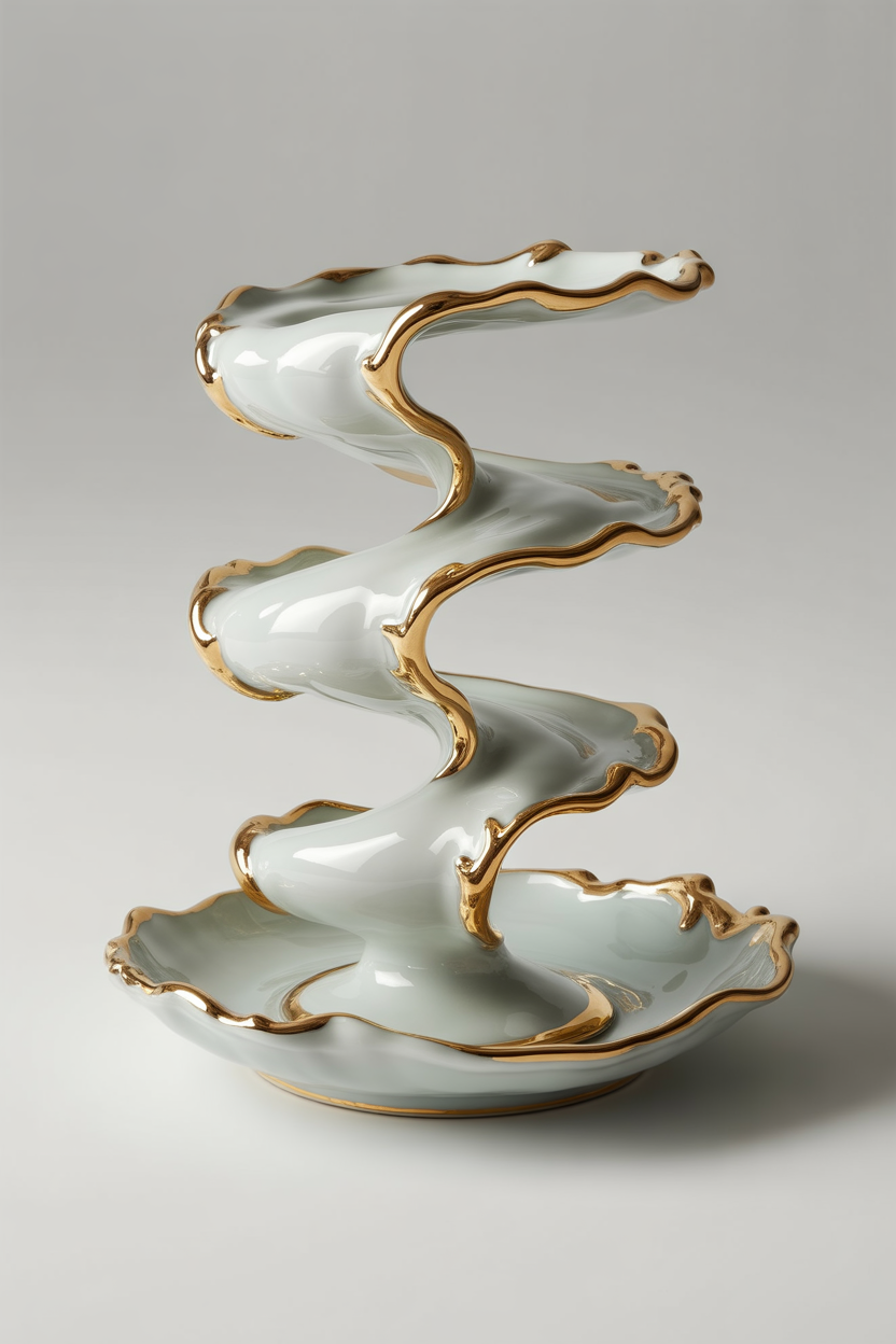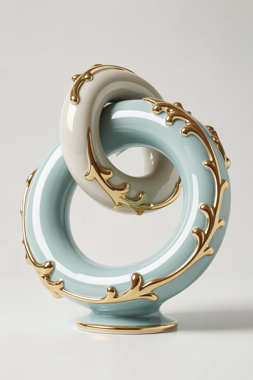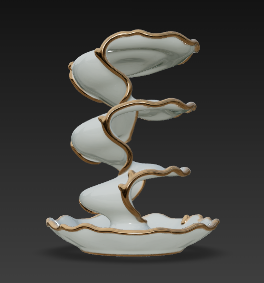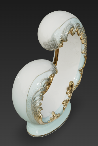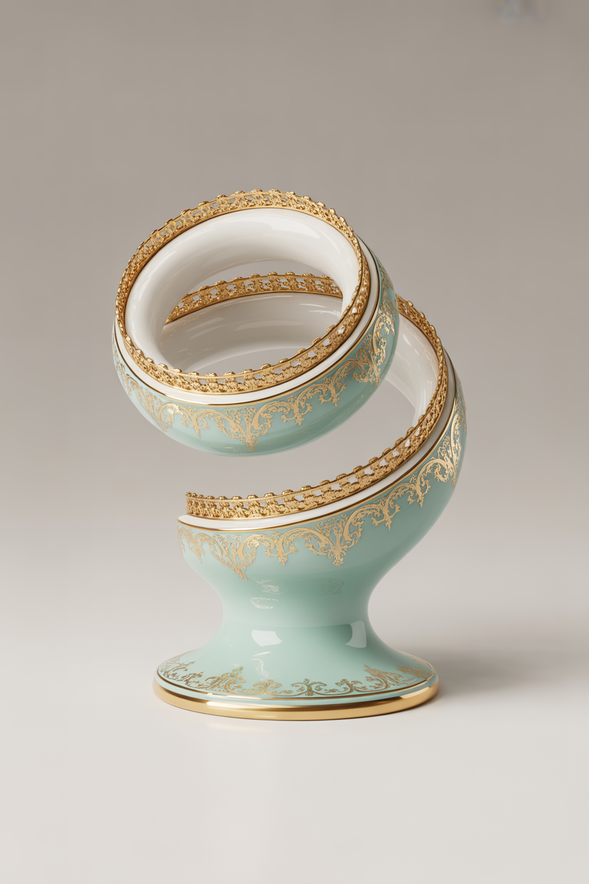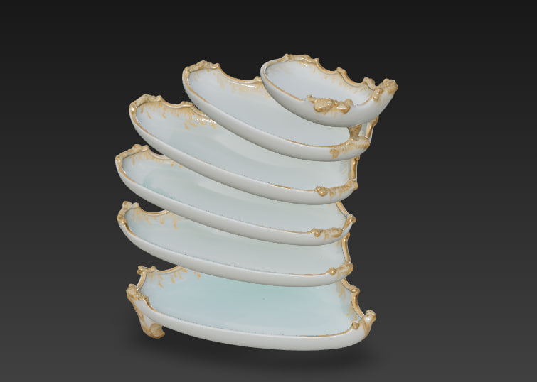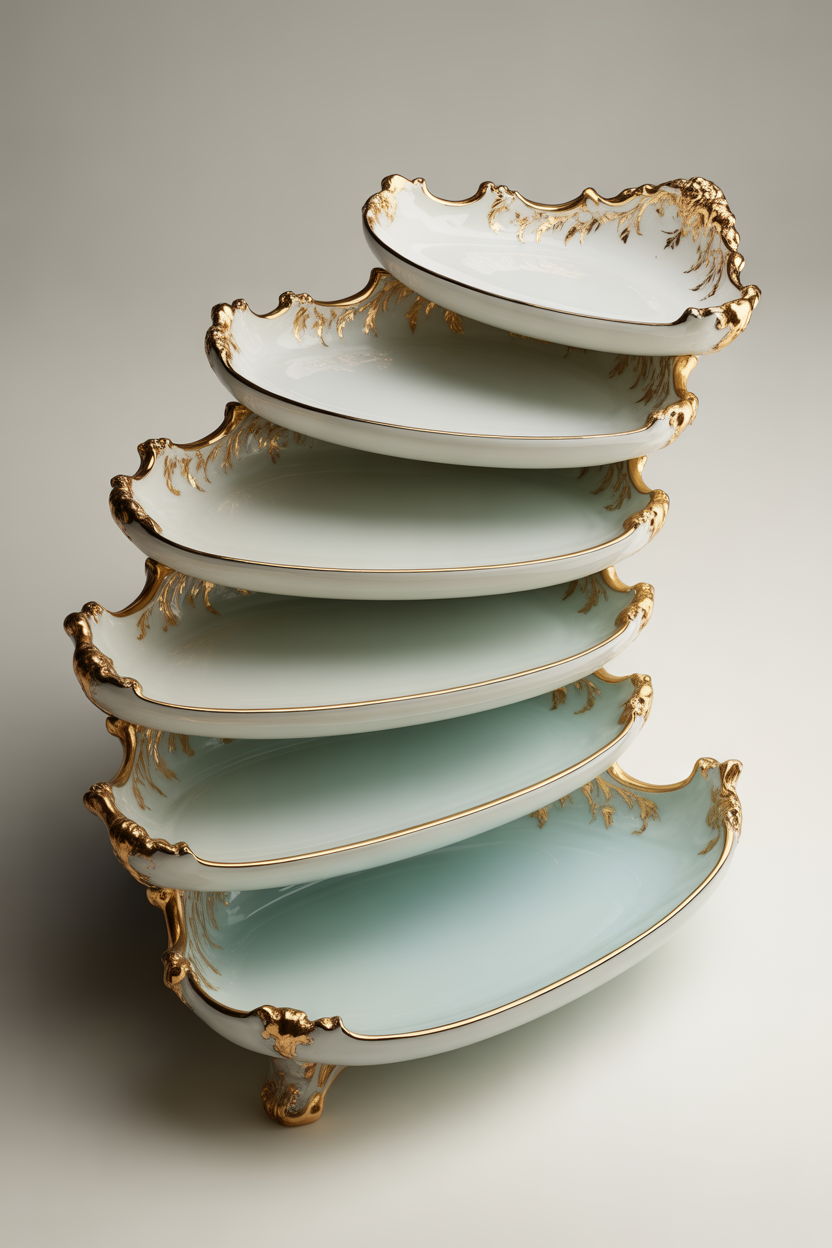 Коллекция Metaform: Rococo представляет собой серию подставок для ювелирных украшений и бижутерии, вдохновлённых эстетикой рококо эпохи Марии Антуанетты. В основе проекта лежит переосмысление форм фарфоровой посуды — ободков, волнистых краёв и орнаментальных деталей — как самостоятельных пластических элементов. Через деформацию, разворот и смещение масштаба эти формы утрачивают прямую связь с сервировкой и превращаются в функционально неопределённые объекты, находящиеся между утилитарным предметом и декоративной скульптурой. Коллекция рассматривает рококо не как воспроизводимый исторический стиль, а как материал для метамодернистского формообразования в современном предметном дизайне.