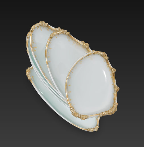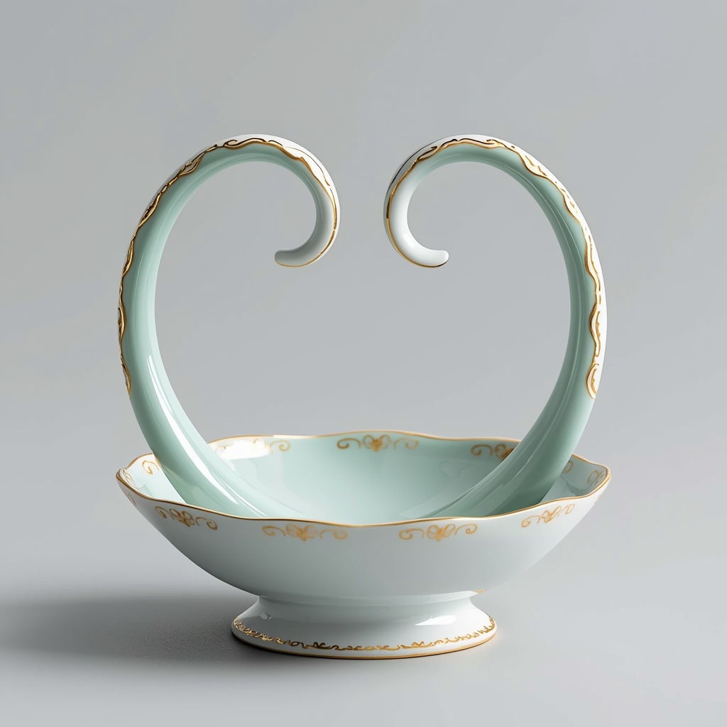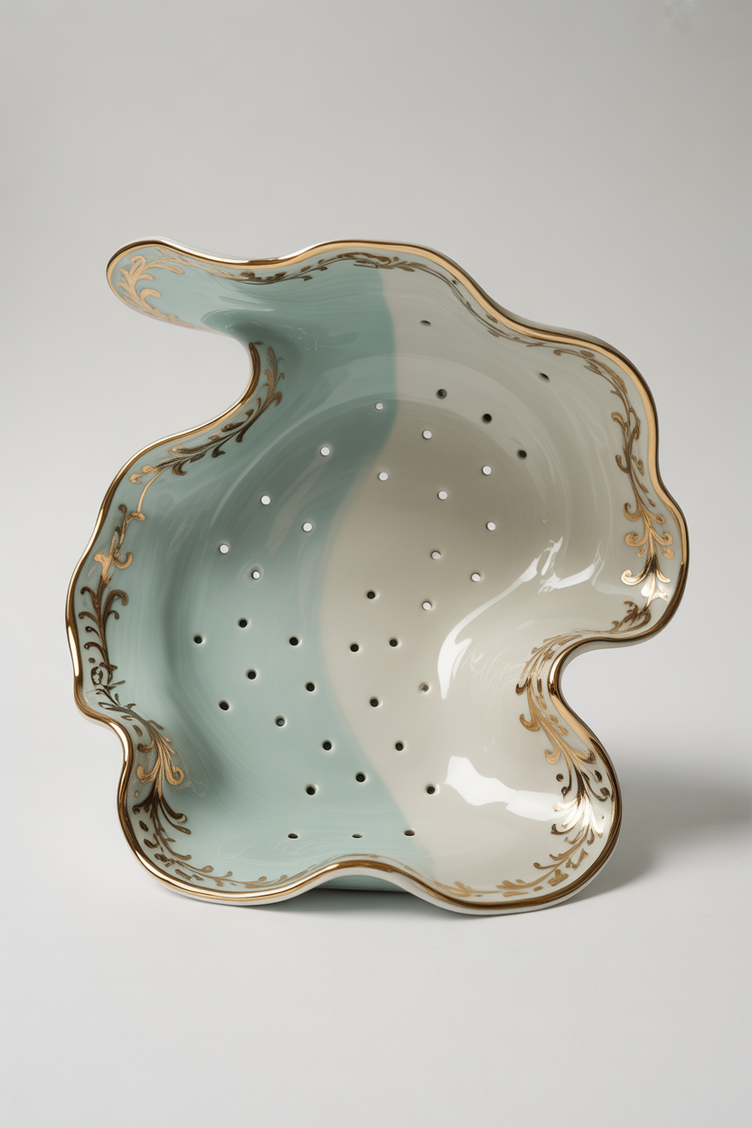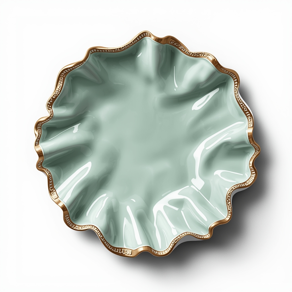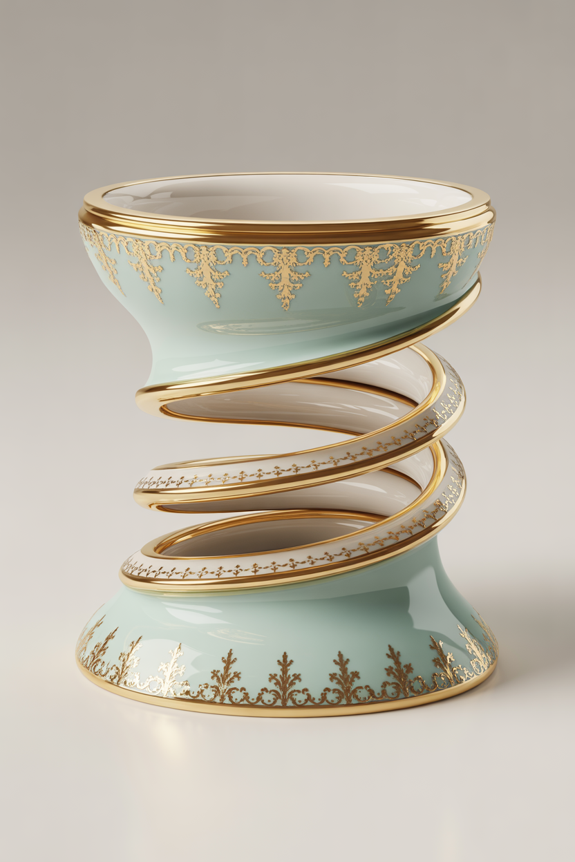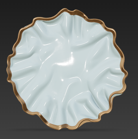 Цвет наносится равномерно, без декоративной живописи. Финиш: высокоглянцевый прозрачный лак (имитация глазури). Матовый финиш не допускается, так как разрушает фарфоровую логику. Декор (опционально): минимальная позолота по краям или линиям формы; исключительно как акцент, не как орнаментальное заполнение.