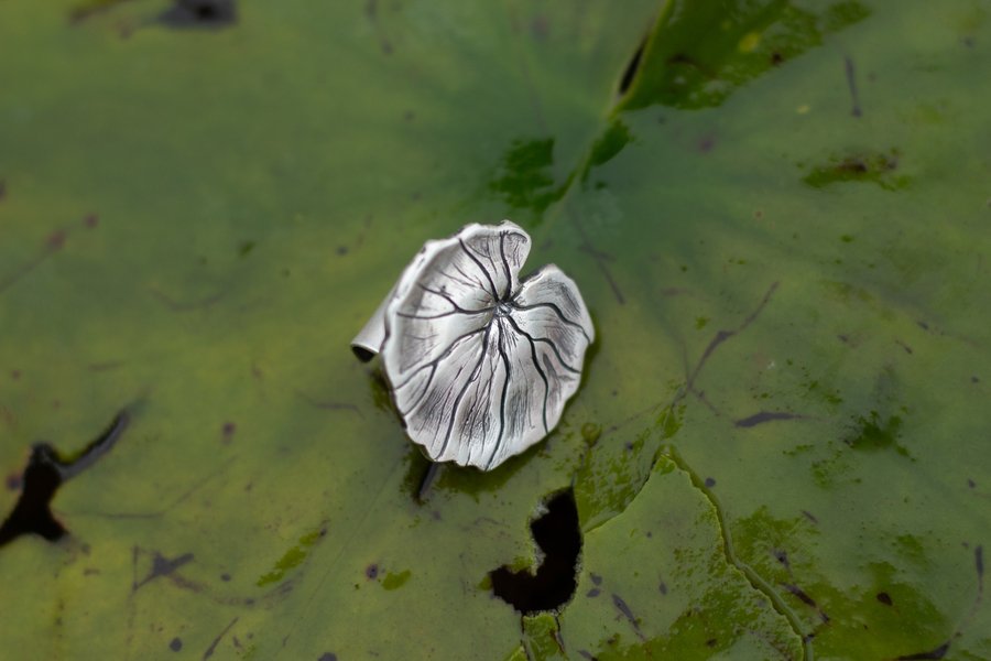 3D-печать использовала для серьги и кулона — нужна была точная симметрия половинок и работа замыкающихся контуров. Восковой лист лотоса был сделан вручную и сразу отправился в литьё серебром.