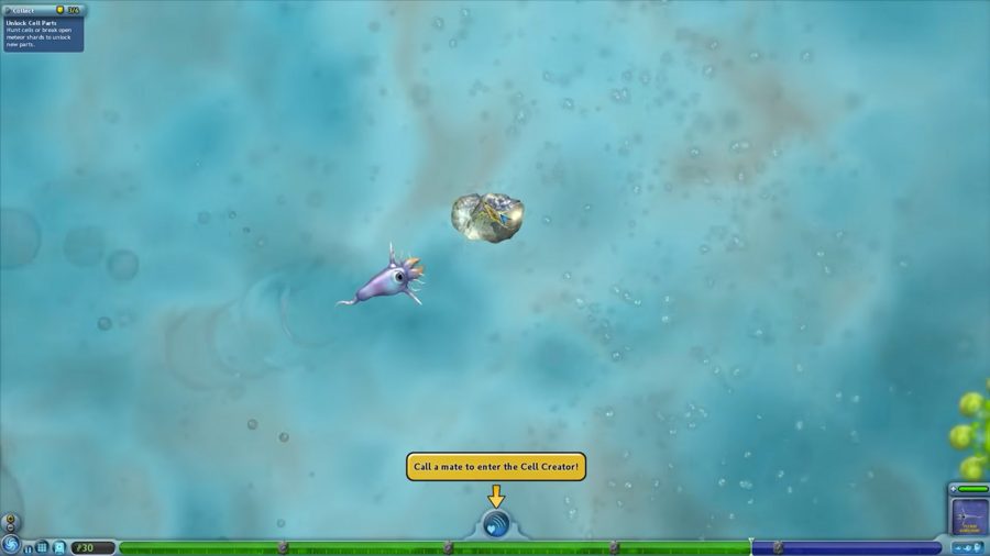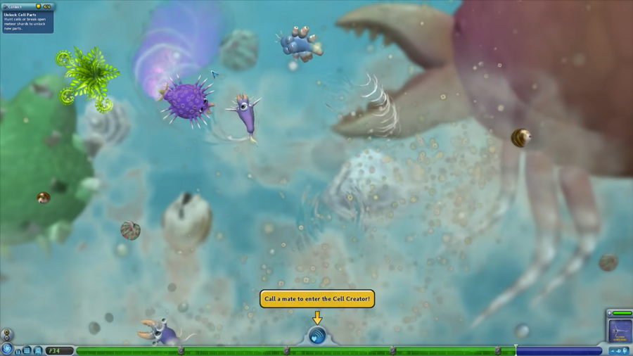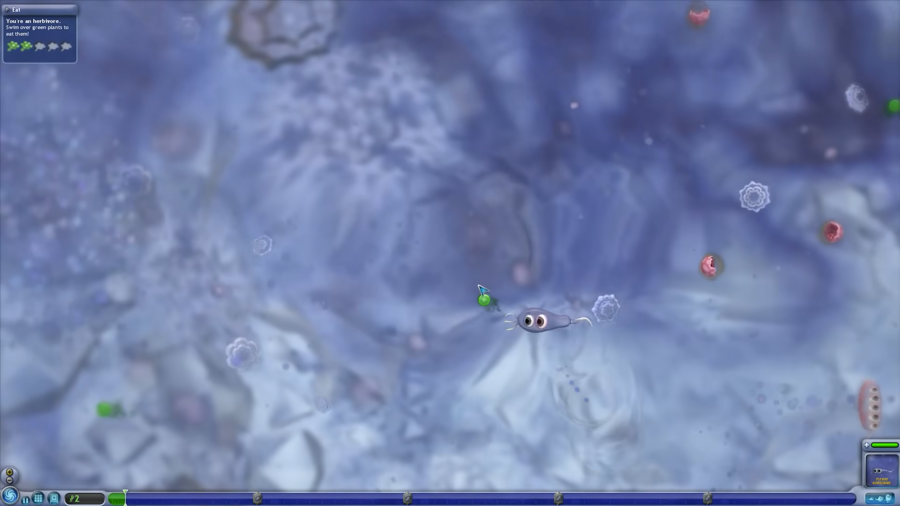 Игра начинается с рождения одноклеточного организма в океане, которое и становится предметом управления. Цель на этом этапе лишь одна — увеличиться до размеров существа путём поедания единиц питания.