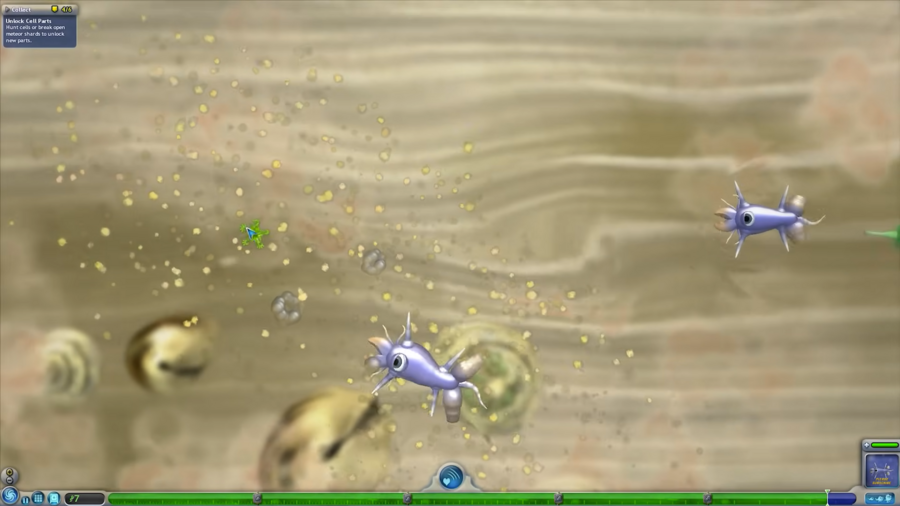 Элемент удачи практически отсутствует, и проявляется лишь при редком нахождении обломков с новыми деталями, которые можно получить и иным путём. Элемент соревнования также почти не характерен первому этапу: клетка учится справляться с агрессивными хищниками, но при появлении новых деталей на теле, другие клетки перестают быть угрозой, а побеждать их и вовсе необязательно — дорасти до следующего этапа можно просто поедая свободно плавающую пищу.