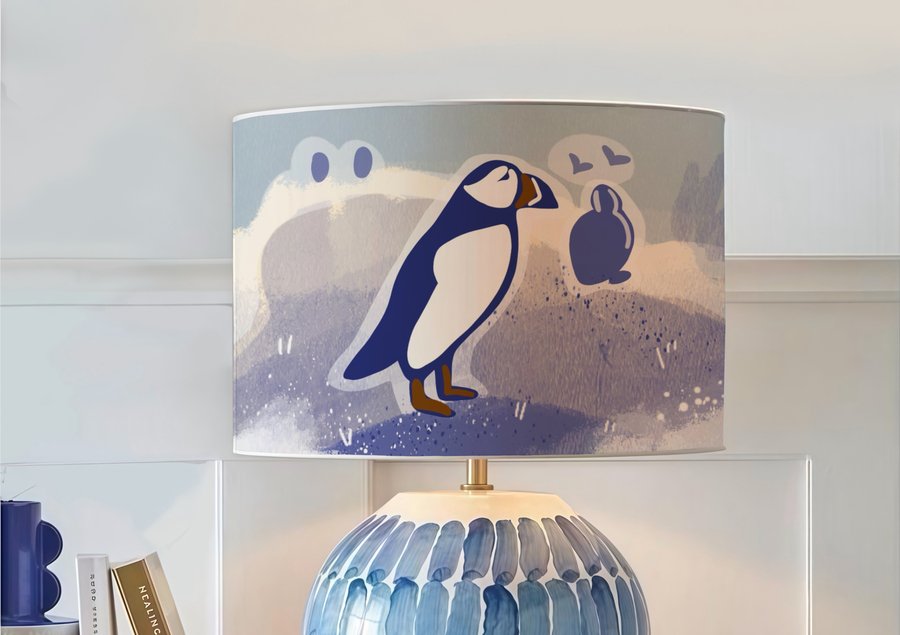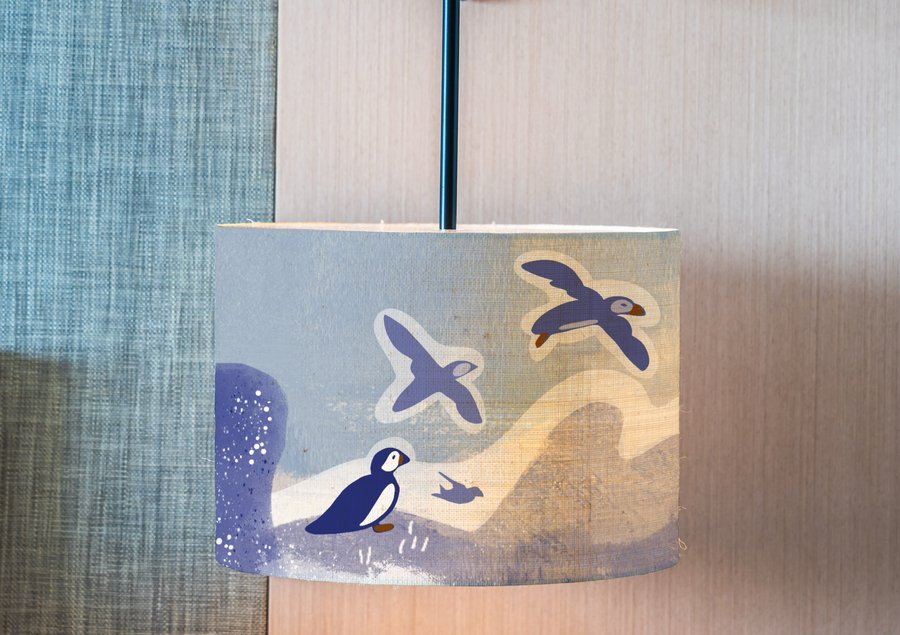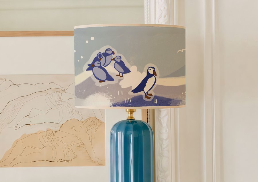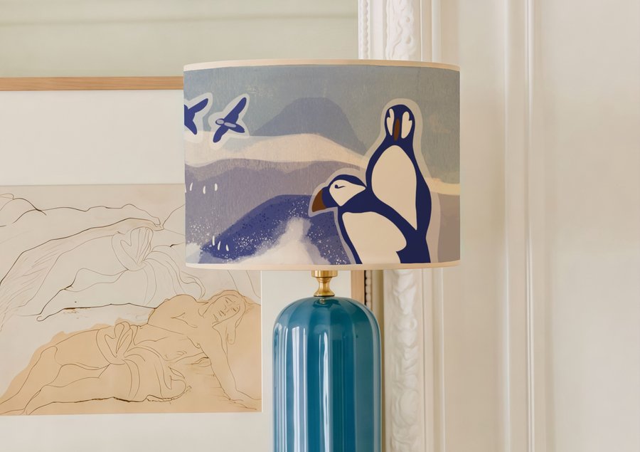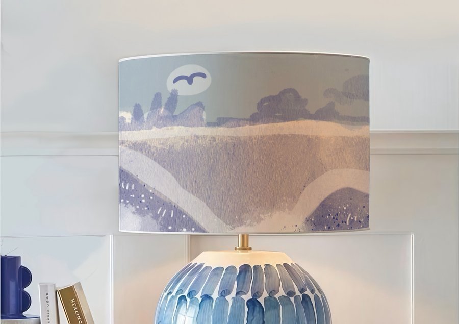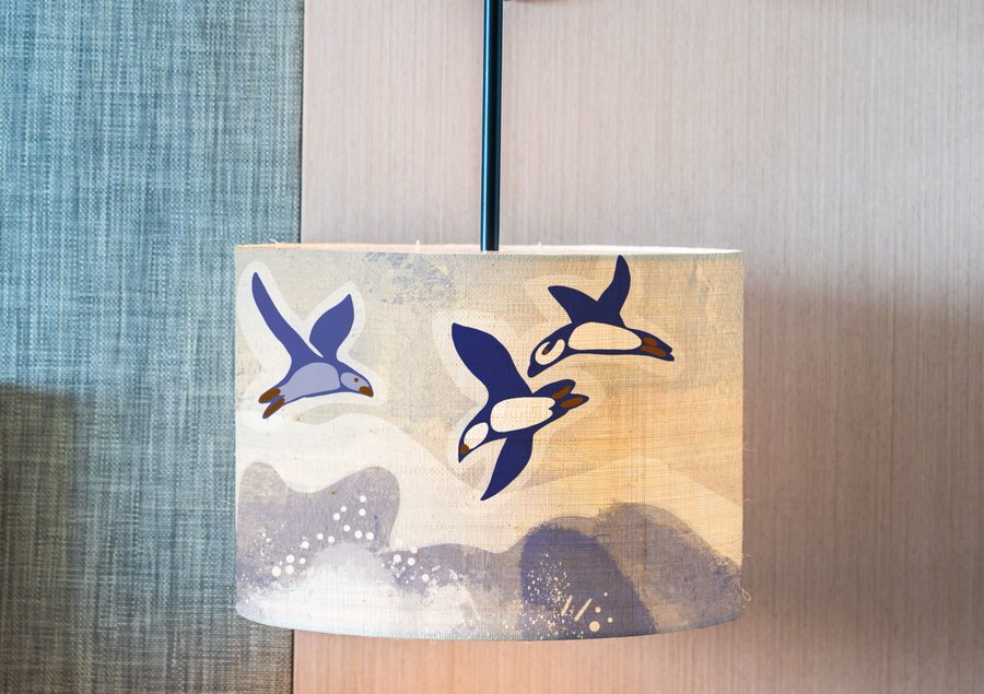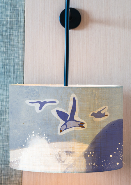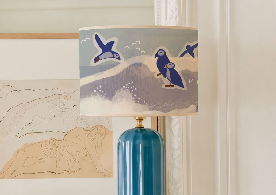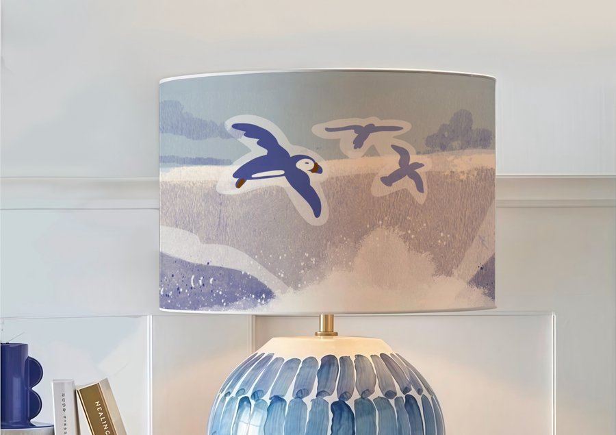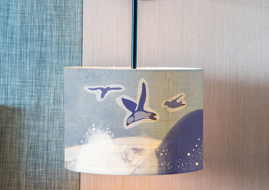 «Между волной и небом» — это не просто абажур, а окно в северное море. Монохромная гамма синих и сиреневых оттенков запечатлела миг полета, где кромка воды встречается с низким небом, а птицы — посланники далёких берегов. Свет, проходящий сквозь иллюстрацию, создаёт в комнате умиротворяющую атмосферу морского простора.