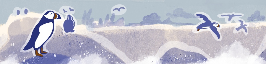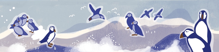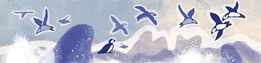 Серия из трех абажуров посвящена северному морю. На них изображены птицы тупики, скалы и волны. Я выбрала монохромную гамму из сиреневых и голубых оттенков, чтобы создать холодную атмосферу. Для акцентов добавила коричневые крапинки на лапках и клювах тупиков.