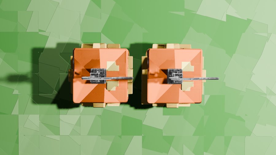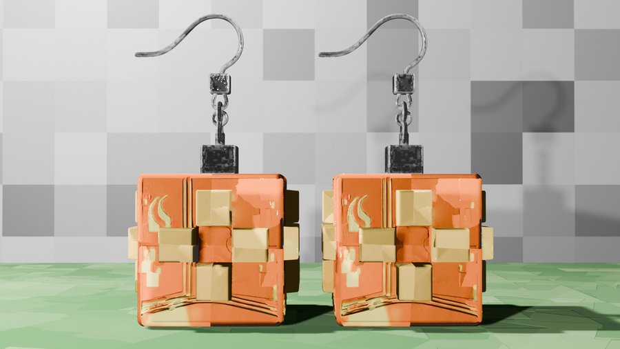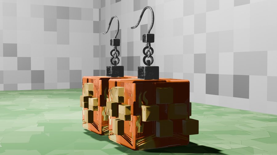 Photorealistic 3D model of a single minimalist drop earring. The main element is a perfect cube with sharp edges. The cube is made of TRANSPARENT, BRIGHT ORANGE resin or glass (like amber), giving it a solid, glowing orange hue while remaining see-through. INSIDE this transparent orange cube, suspended in a 3D grid, are smaller, OPAQUE, MATTE YELLOW perfect cubes. These yellow cubes are arranged in the exact sparse, irregular 3D pattern of the classic Minecraft lava block sprite, as if frozen within the volume. A tiny, solid metal cube in brushed stainless steel or matte gunmetal is perfectly fused to the center of the top face of the main orange cube. From this metal connector cube, a very short, delicate chain extends upwards. The chain consists of exactly three small, flat, square links, made of the same metal. The chain connects to a simple, thin, wire ear hook (also the same metal), bent at a 90-degree angle. The entire construction is geometric, precise, and minimalist. The transparent orange main cube allows full view of the suspended yellow pixel-cubes inside. The aesthetic is static, architectural, and wearable. Clean studio lighting, sharp focus, isolated on light grey background. Style: hyper-detailed 3D product visualization, 8k, for manufacturing. NOT fiery, NOT with flames, NOT with liquid effects, NOT solid matte orange, NOT clear transparent. The main cube must be TRANSPARENT ORANGE. The yellow elements must be distinct matte cubes inside it. The metal components (hook, chain links, top connector cube) must be simple, geometric, and made of the same brushed metal.