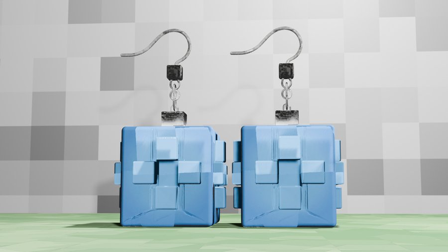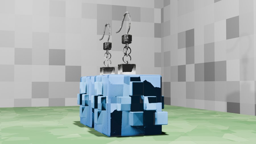 Серьги: Размер основного прозрачного куба: 8×8x8 мм. Внутренние элементы: матовые кубики, зафиксированные в объемной сетке. Крепление: цепочка из квадратных звеньев и швенза из матовой нержавеющей стали или черненого серебра. Ключевое требование: внутренние кубики должны быть статичны, не смещаться при движении.