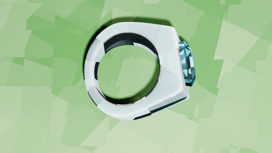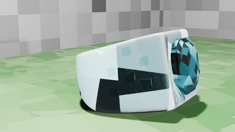 3D concept art, jewelry design, wearable object. A minimalist, geometric 3D model of a ring for men and women, inspired by Minecraft. The design reinterprets the game’s iconic diamond. The ring is made of a single, solid piece of matte, textured turquoise ceramic or frosted glass. The band is square in cross-section with slightly softened edges. Instead of a traditional setting, the «diamond» is a large, smooth, pixel-inspired turquoise egg-shaped cabochon. The cabochon is seamlessly fused into the band, as if growing from it. The cabochon has 8 subtly visible flat facets, mimicking a low-poly 3D model, and a deep, rich turquoise color with a slight internal glow. The overall form is bold, sculptural, and monolithic. In the style of contemporary minimalist jewelry design, clean 3D render, studio lighting, soft shadows, hyper-detailed, focus on materials and texture, matte surface, octane render, unreal engine 5, photorealistic, 4k. The image should look like a professional product visualization for a 3D printing blueprint. Color palette: Deep minecraft turquoise, matte finish, frosted glass effect. Material: textured ceramic, matte glazed porcelain. Isolated on a clean, light gray background. Front and three-quarter view. NOT a literal Minecraft pixel ring, NOT shiny or metallic, NOT a traditional jewelery setting with prongs. DO emphasize monolithic, one-piece construction and soft geometry.