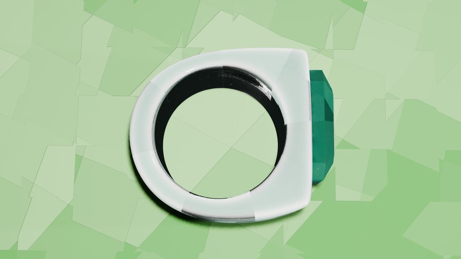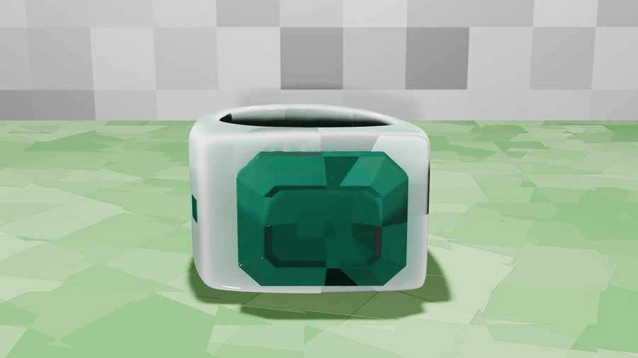 3D concept art, jewelry design, wearable object. A minimalist, geometric 3D model of a ring for men and women, inspired by Minecraft. The design reinterprets the game’s iconic emerald. The ring is made of a single, solid piece of matte, textured emerald green ceramic or frosted glass. The band is square in cross-section with slightly softened edges. Instead of a traditional setting, the «emerald» is a large, smooth, pixel-inspired emerald green cabochon in the shape of a flattened hexagonal prism (a soft-edged rhombus). The cabochon is seamlessly fused into the band, as if it is an extrusion of the band itself. It has 6 subtly visible long facets running from top to bottom, referencing the classic emerald cut and the in-game sprite. The color is a deep, rich emerald green with a cool, opaque tone and a slight internal glow. The overall form is architectural, sharp yet wearable, and monolithic. In the style of contemporary minimalist jewelry design, clean 3D render, studio lighting, soft shadows, hyper-detailed, focus on materials and texture, matte surface, octane render, unreal engine 5, photorealistic, 4k. The image should look like a professional product visualization for a 3D printing blueprint. Color palette: Deep minecraft emerald green, matte finish, frosted glass effect. Material: textured ceramic, matte glazed porcelain. Isolated on a clean, light gray background. Front and three-quarter view. NOT a literal Minecraft pixel ring, NOT shiny or metallic, NOT a traditional jewelery setting. DO emphasize monolithic, one-piece construction, sharp geometric angles, and a sleek profile. The design should be a clear sibling to the turquoise diamond ring, but with its own distinct geometric character.