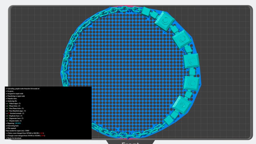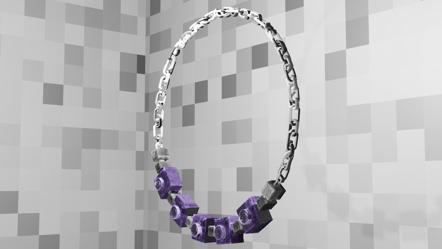 NOT a random pattern. NOT varying sizes. NOT different spirals. NOT pendants on a chain. The MAIN CUBES and their internal spirals must be 100% UNIFORM and IDENTICAL to each other. The construction must show the precise, integrated sequence of chain — metal connector cube — main purple cube — metal connector cube — chain.