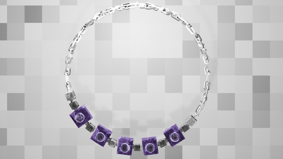 Ожерелье: Размер прозрачных фиолетовых кубов: 6×6x6 мм. Количество повторяющихся элементов (кубов): 10-12. Внутренний элемент: идентичная матовая сиреневая спираль в каждом кубе. Цепь: из квадратных звеньев, материал — матовая нержавеющая сталь или черненое серебро. Длина: 50-55 см. Замок: минималистичный магнитный шарик, вписанный в геометрию цепи.