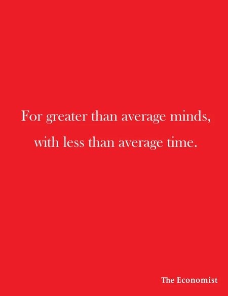 Хорошим примером также будут рекламные плакаты The Economist. Красный фон + короткий текст. Логотипа почти нет, но фирменный красный цвет и шрифт передают характер бренда: умный, лаконичный, остроумный.