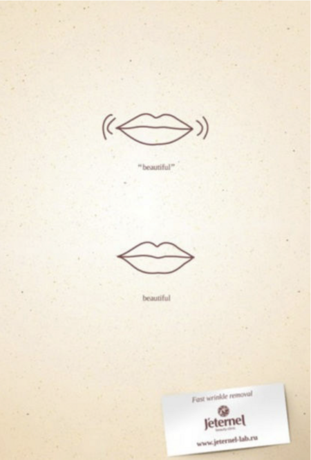 Хорошим примером применения выразительных приёмов в минималистичной рекламе может служить кампания клиники красоты Jeternel. В ней используется лёгкий юмор, который превращает сообщение в понятную и доступную метафору.