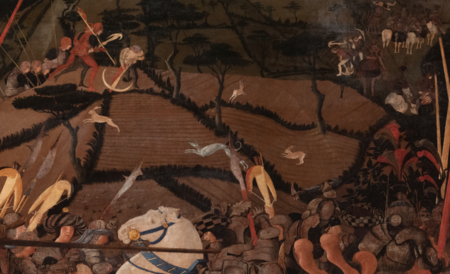 В двух картинах Паоло Уччелло из серии «Битва при Сан-Романо» природа работает так, что пейзаж обеспечивает ощущение реальной глубины, хотя ещё очень условной.