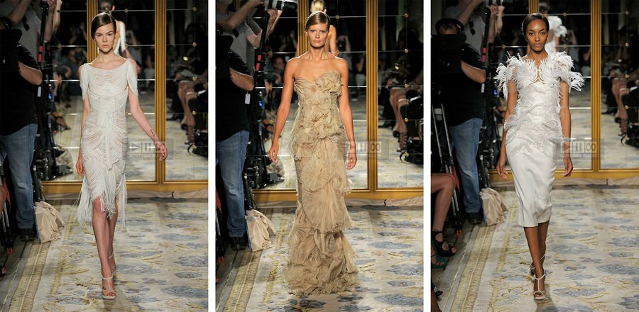 Известная своими вечерними нарядами, Marchesa включила в коллекцию элементы ар-деко: богато украшенные платья с вышивкой, пайетками и перьями. Этот бренд подчеркнул роскошь и театральность эпохи, идеально вписываясь в атмосферу праздничных мероприятий и джазовых вечеринок.