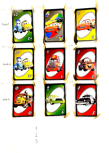 Я посчитала довольно скучным просто по очереди играть партии и сделала партитуру с помощью которой можно построить гитарные партии (соло и риф) через проигрыш и выигрыш в уно. Называется mud and straw потому что одно straw а другое mud.