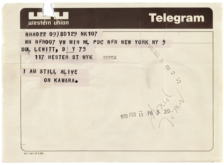 Он Кавара «Я всё ещё жив», 1969-2014 URL: https://www.guggenheim.org/teaching-materials/on-kawara-silence/telegrams-i-am-still-alive (дата обращения 19.12.2025)