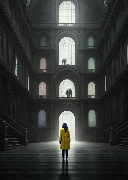 Героиня стоит перед гигантским входом в Музей. Масштаб архитектуры подавляет человека. Мы видим её со спины: старая женщина в желтом плаще на пороге открытия. Это момент страха и любопытства — она пришла встретиться с версиями себя, которыми никогда не стала